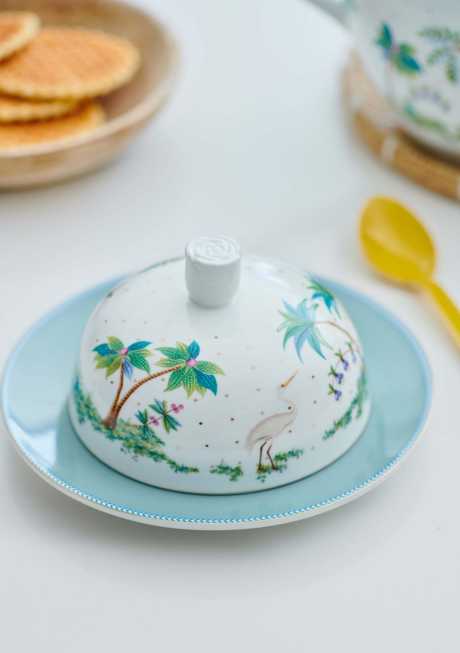 This tropical butter dish of our Jolie collection will brighten up your table in no-time. The dish is decorated with golden dots and has a design of various tropical plants, trees and exotic species. The platter has a blue background and matches perfectly with the lid. Combine this butter dish with other products of our Jolie collection for a stylish table.