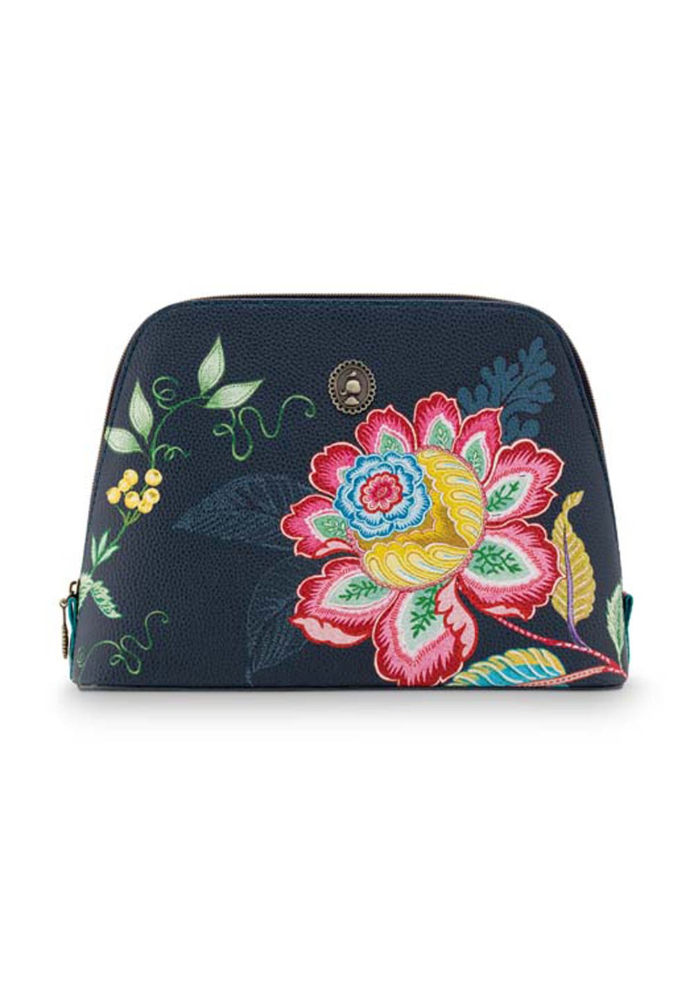 This blue toiletry bag is made of water-repellent faux leather that is fully printed with the Jambo Flower design. This medium size has a brass zipper on the outside, with two compartments inside, of which one a zipper. Decorated with enamel Pip emblem.