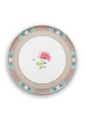 Both the plate and base of this small khaki round cake tray are decorated with an elegant design, exotic flowers, and golden details. Combines beautifully with the pastry plates and coffee and tea porcelain sets in the Blushing Birds collection.