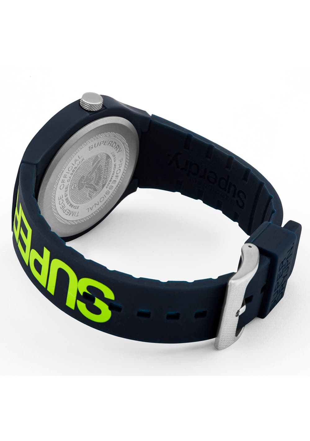 <p>A visually stunning watch with a minimalistic dial. Superdry logo in clear yellow set on black. This model looks fantastic and is powered by precision Japanese quartz technology.</p> <ul class="a-unordered-list a-vertical a-spacing-mini"> <li><span class="a-list-item"> 3 Hands </span></li> <li><span class="a-list-item"> Navy Silicone with Lime Branding </span></li> <li><span class="a-list-item"> Quartz Movement </span></li> <li><span class="a-list-item"> Case Diameter: 43mm </span></li> <li><span class="a-list-item"> Water resistant to 50m (165ft: in general, suitable for short periods of recreational swimming, but not diving or snorkeling </span></li> </ul>