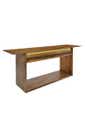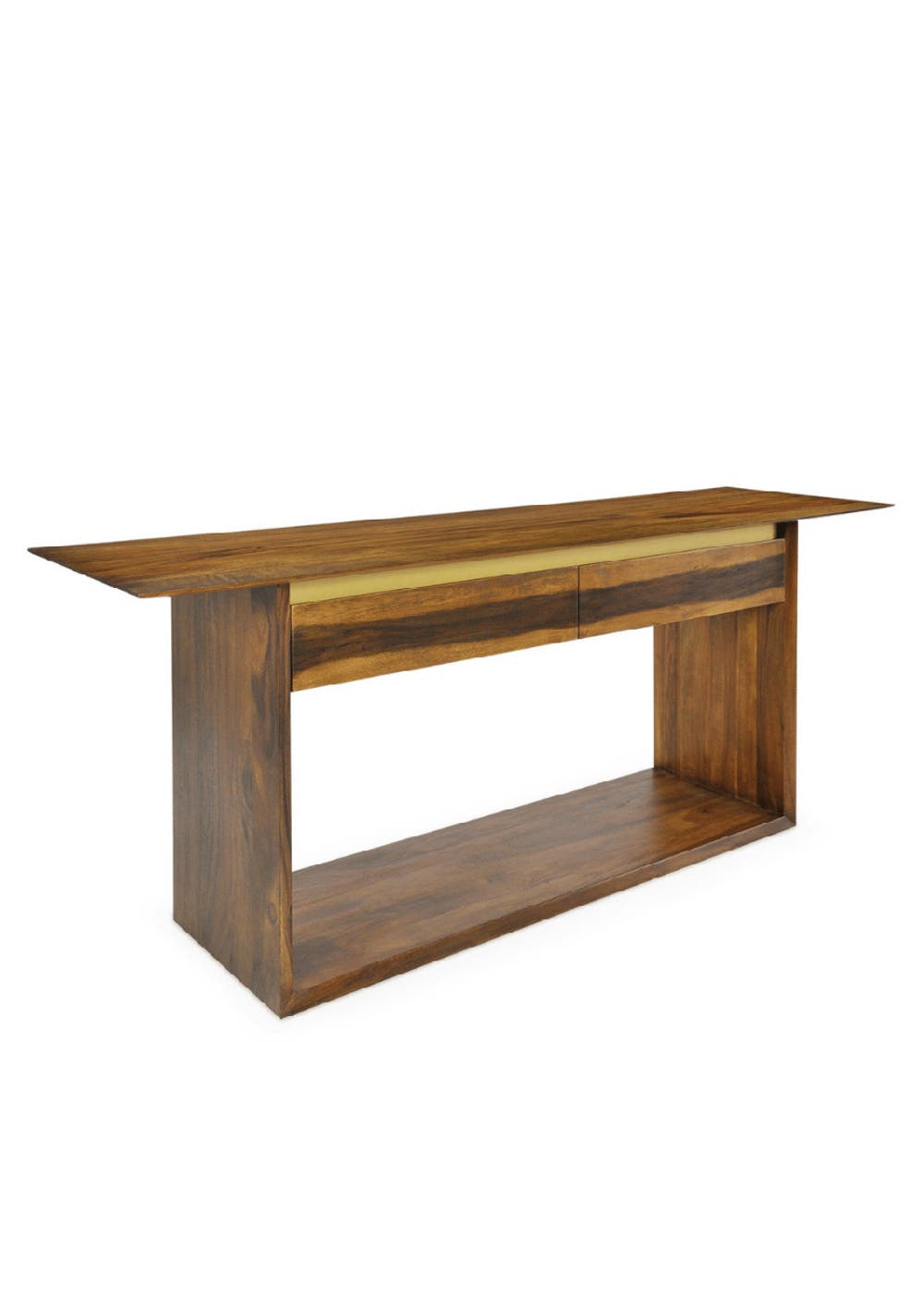 Featuring Brass Strip this solid mango wood 2 drawer console table has an open shelf underneath for extra storage or display. Colour: Cognac Streak & Polished Brass Bright Glossy Material: Mango Wood & Mdf back sheet of drawers Size: Length: 180 x Width: 50 x Height: 80.5cm