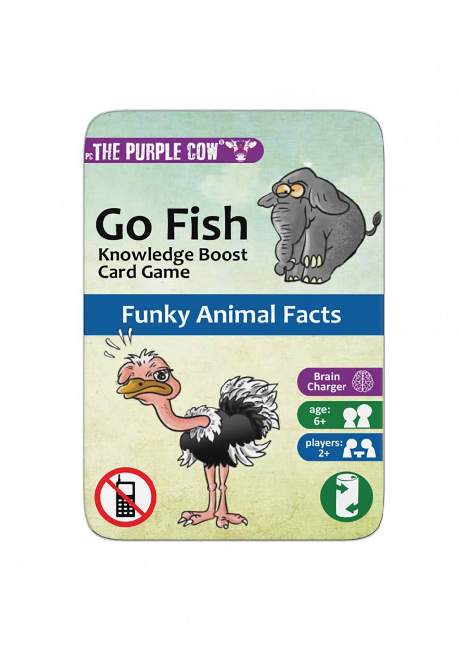 The Purple Cow "Go Fish" is a FUN and easy to play card game also known as Quartet, Foursomes and Trumps around the world - detailed instructions inside. But it's not just a fun game; it is much more important than that - it instils basic general knowledge that is so much missing in our fast-paced digital world. By playing our "Go Fish" series, children will learn funky facts about animals on our planet. Incredible, surprising and funny facts that are sure to put a smile on your face! There are 41 cards, suitable for ages 6+