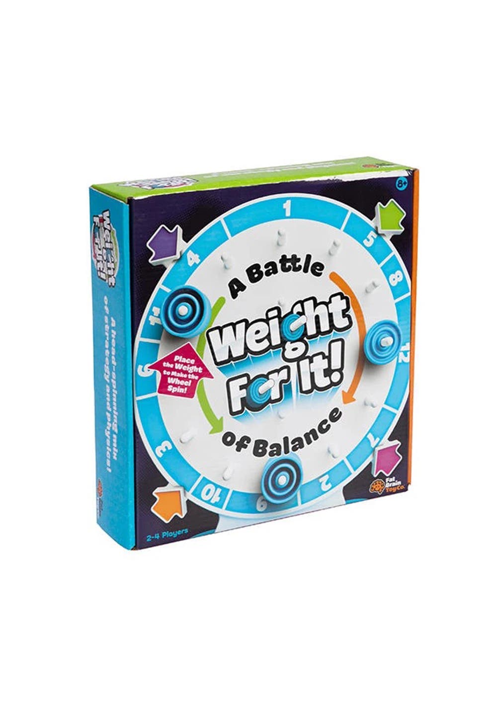 A head-spinning mix of strategy and physics!.... Players take turns placing the weights onto the wheel to try and make it rotate so the correct arrow is aligned with the number and colour on their card. Line it up just right and you get to keep the card as a point. Get it wrong and you have to wait to try again on your next turn. Can you handle the suspense as the wheel swings back and forth past your number? The first to earn three cards wins the game! ogic and reasoning are sure to twist and turn into knots of thrilling confusion with the fascinating game of Weight For It