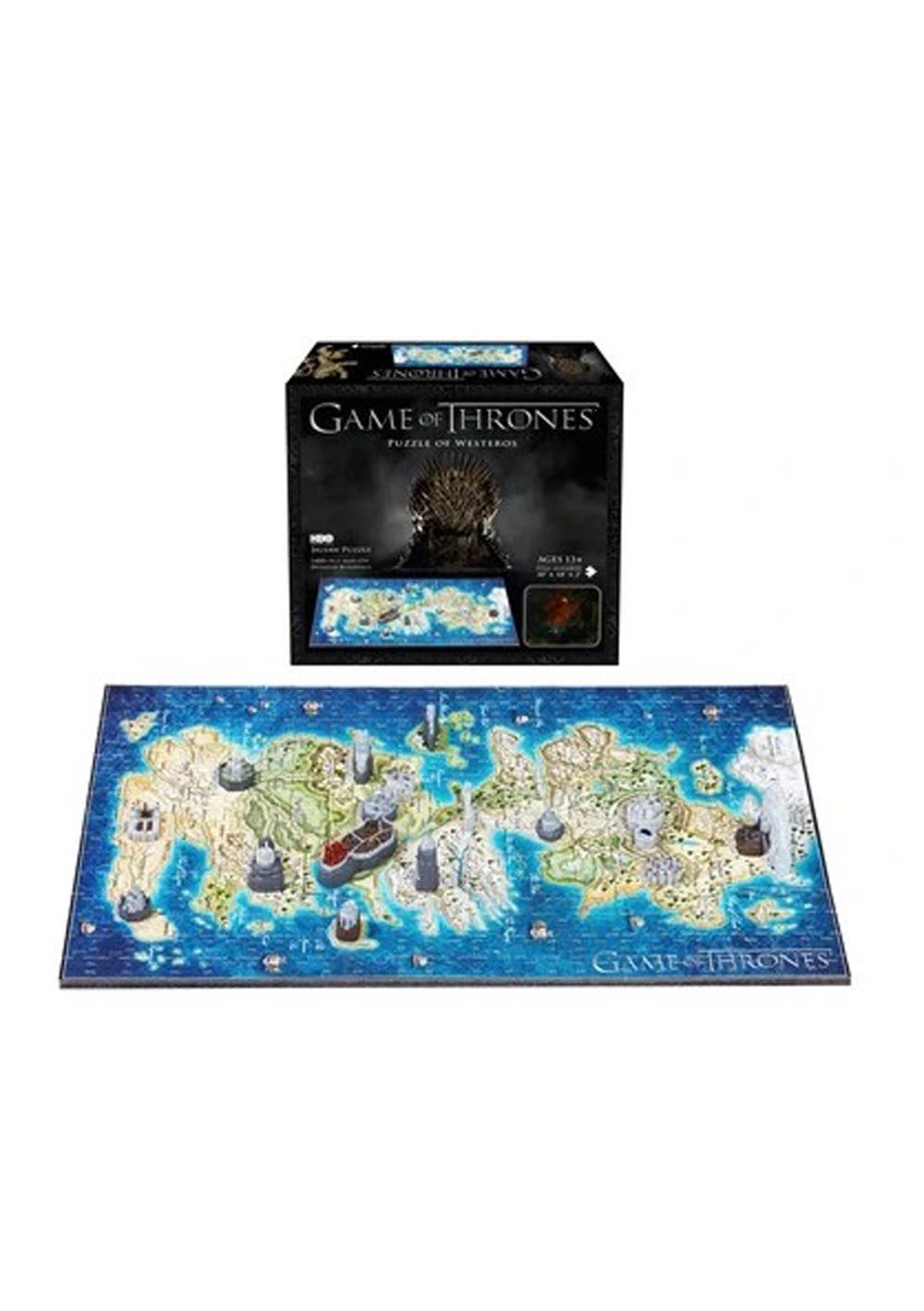 Game of Thrones, the award winning HBO television series. Based on the best selling 4D Puzzle of Westeros, This mini replica will guide players through the assembly of the map of Westeros in a patented layer design. The first layer is a 340+ pieces jigsaw puzzle that will teach you all about the various locations and regions of Westeros. The second layer adds the 3D miniature replicas models that you insert into the puzzle, which include famous cities and castles such as Kings Landing, Winterfell, Eyrie, the Wall, and more! It's a perfect collector's item and great gift for the Game of Thrones fan. Ages 7+. The fully assembled product measures 43 x 26 x 2.54 cm.