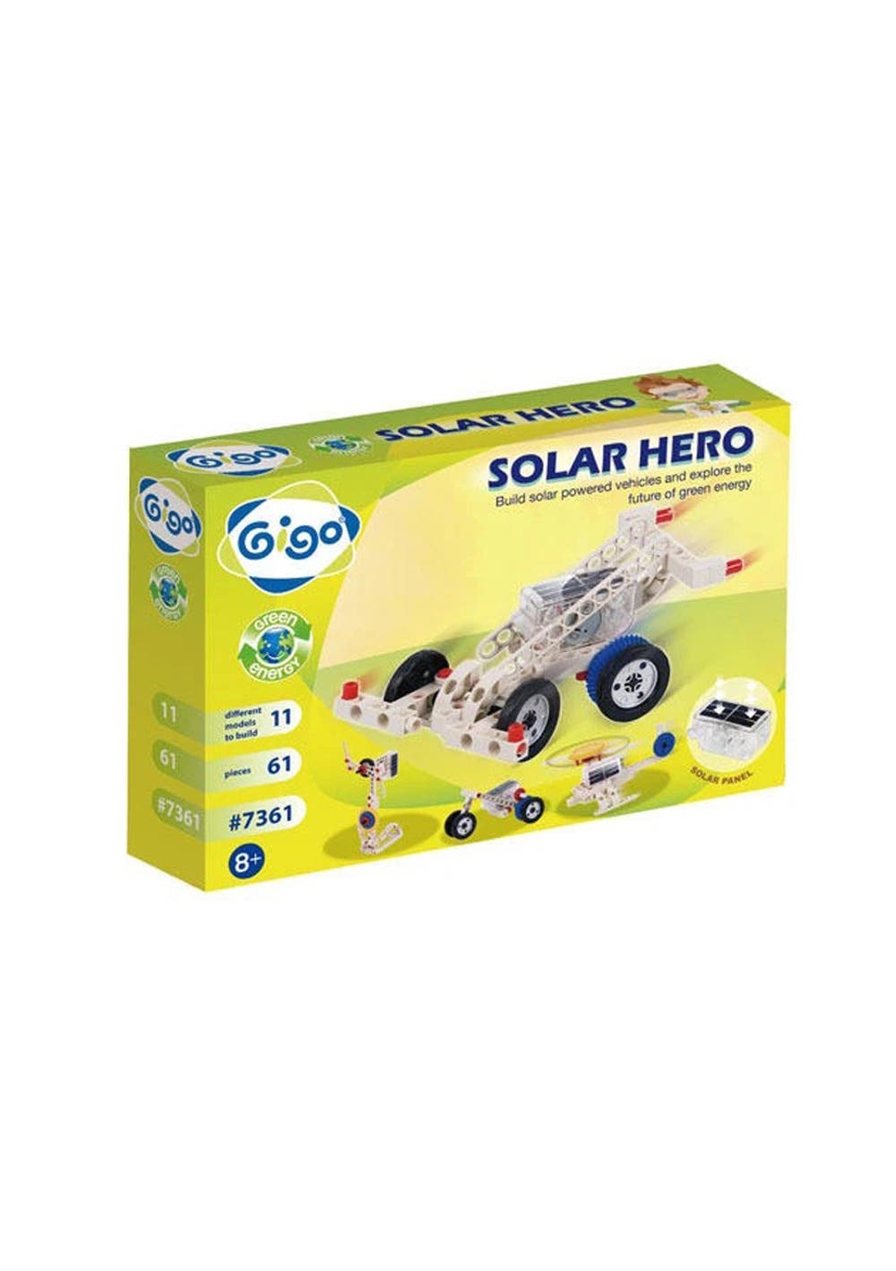 Build solar powered vehicles and explore the future of green energy with Gigo Solar Hero. Construct 11 different solar powered models using some of the 61 included pieces. Children can have fun and learn about the basics of solar power, and also gear ratio by different speeds and power from the models. The included 60 page colour booklet features step by step instructions to build cars, helicopters, a robot, plane and more. The included patented solar power pack consists of a solar panel, a motor and a gear speed reducer which can transform solar power into electricity and then drive the model! Contents: 61 pieces; Batteries: Not required; Box size: 330 x 70 x 220 mm; For Ages 8 Years+