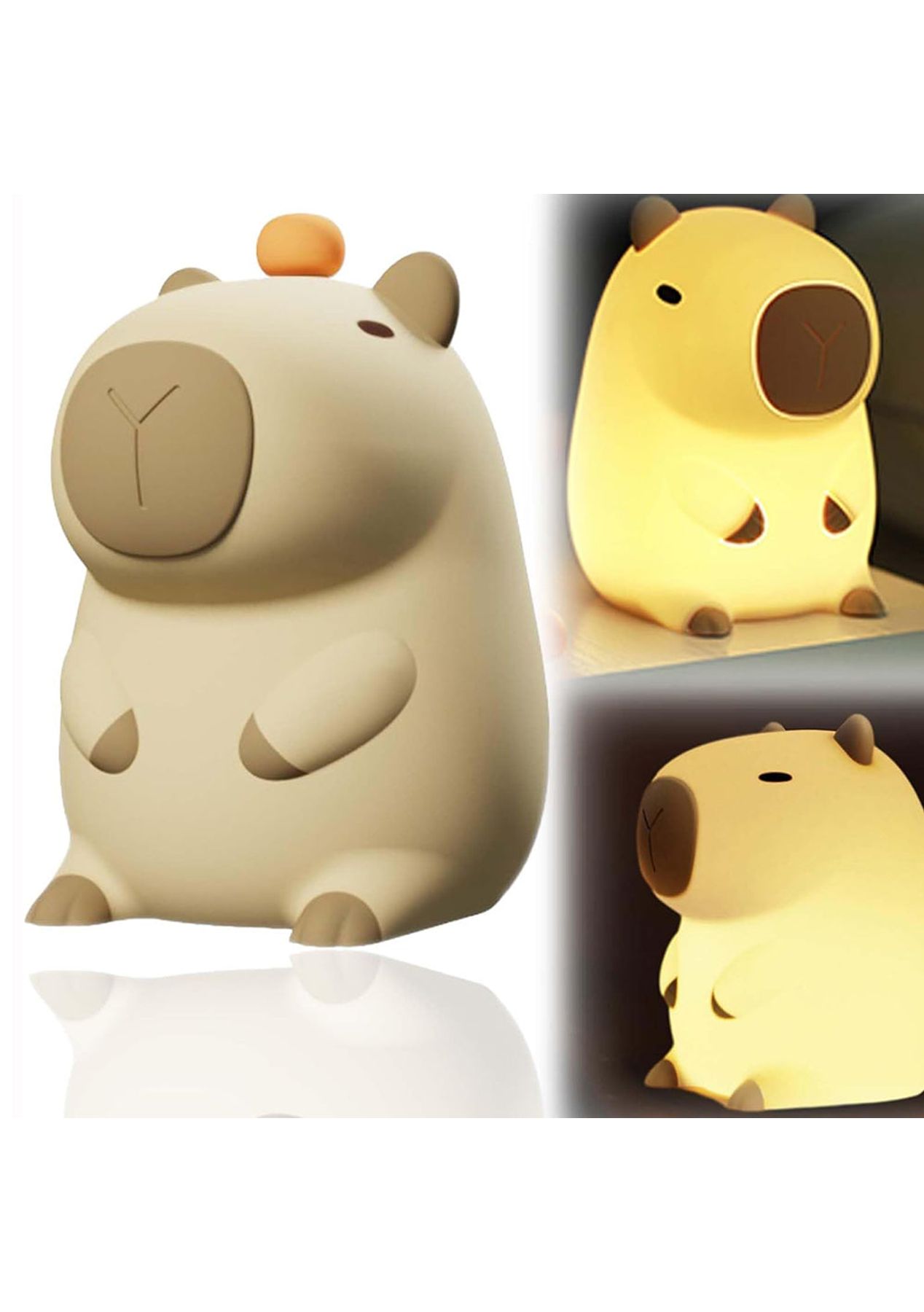 Product Description: Create a soothing and adorable ambiance with this Cute Capybara LED Touch Lamp for Kids. Made from environmentally friendly silicone material, this night light is safe and non-toxic, providing a comforting glow for your child's peaceful sleep. It's the perfect companion for a good night's rest.With a simple touch, you can adjust the brightness levels of the lamp. A single pat activates the first level of gentle brightness, ideal for sleep. Two pats increase the brightness slightly, creating a cozy atmosphere. Three pats turn off the light altogether.Equipped with a timer function, this baby night light offers convenient timing options for kids' rooms. Set it to the "20" position, and it will automatically turn off after 20 minutes, saving energy.The lamp features a built-in 1200mAh battery, providing up to 56 hours of soothing light or 16 hours of the brightest light. Its handheld size allows for easy portability, making it a perfect companion wherever your child goes.The delightful capybara design is a favorite among kids, and its warm light creates a romantic and sweet atmosphere. It's an excellent decoration for birthdays, Valentine's Day, Christmas, Halloween, and more. Suitable for bedrooms, living rooms, nurseries, offices, and reading areas.Product Specification:Color: Warm LightWeight: 300gMaterial: ABS + PC + Silica GelControl Method: TouchLight Source Type: LEDSize: 9.8 x 16.5 x 11 cmRated Input: 5V-0.5ACharging Time: 3 hoursWorking Time: 16 hoursBattery Information: 1200mAhPower Supply: USB-RechargeableFunction: Silicon Touch Lamp for KidsPackage Inclusion:1 x Night Light1 x Charging Cable 1 x Manual