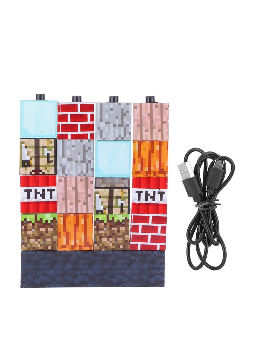 Product Description: Light up your space however you want with the Minecraft Block Building Lamp, a set of 16 separate light blocks that can be arranged in any combination on the bed baseThis set comes in a printed box and includes iconic blocks from the game such as Grass, TNT, Diamond Ore, Redstone, Gold, Furnace, Crafting Table, Jack o Lantern, WatermelonUse this night light as a desk lamp and place it on the nightstand next to your bed. It's the perfect way to light up your man cave, bedroom, nursery, toddler's playroom, or themed home theaterThis quality collectible is a one-of-a-kind accessory for any hobbyist. Gift this cool collector's merchandise to moms, dads, fans, kids, boys, and girls who love pop culture funNote: Pieces can be stacked together. LED light turns on when the blocks are stacked together and stays off when disassembled.?Product Specification:Material: ABSSize: 12x3x15.3cmWeight: 197gFunctions: Night Lamp Battery Information: USB Plugged-in?Package Inclusion:16 * Cubes1 * Base 1 * USB Cable
