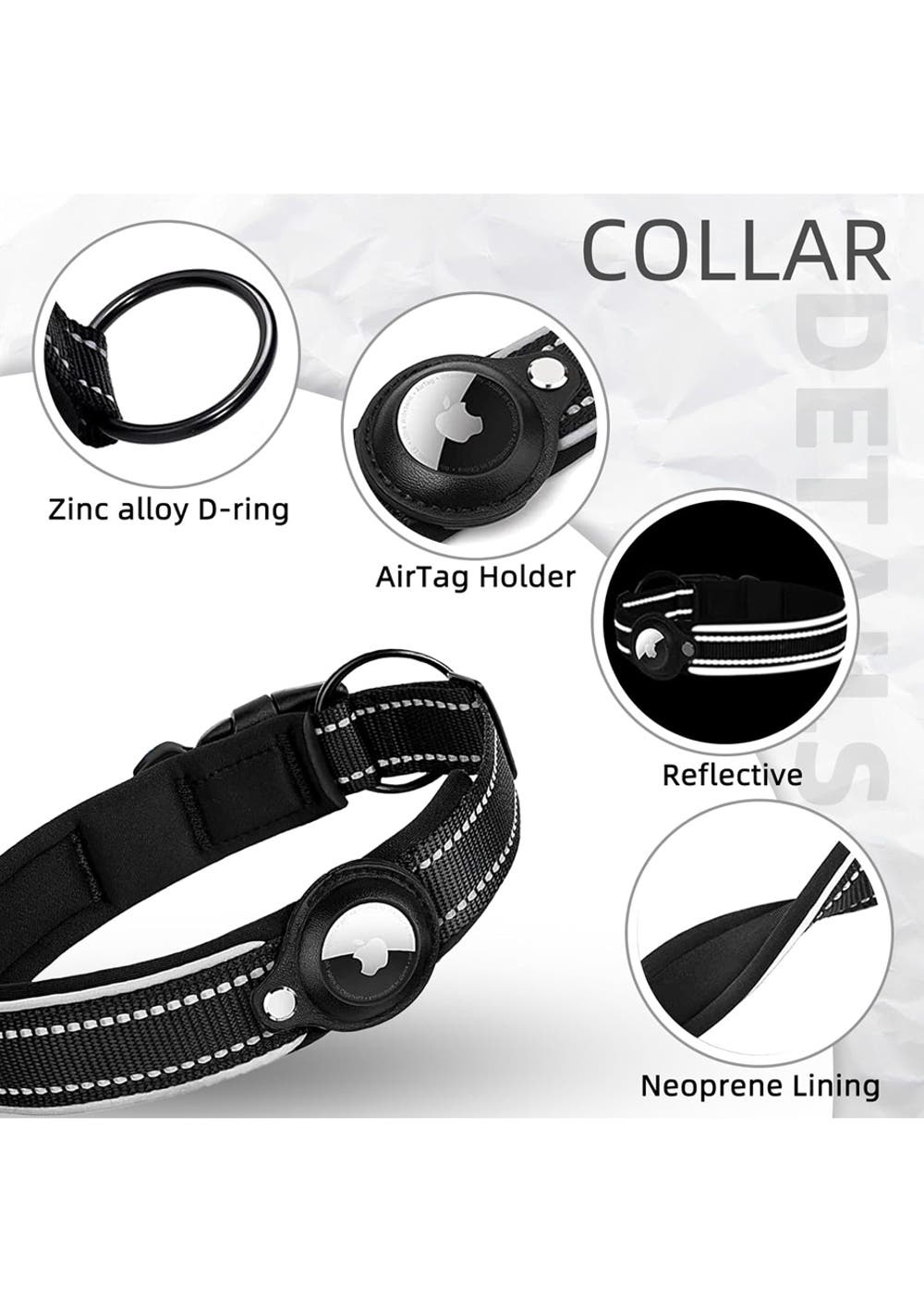 Dog Collar with AirTag Holder Case-L<br><br>Material: Nylon, Neoprene, Metal<br>Product dimensions (LWH): 3×43-50cm <br>Package dimensions (LWH): 15x6x4cm cm<br>Weight: 60 g<br>Track Your Furry Friend with Ease: Introducing Our Dog Collar with Integrated AirTag Holder Case <br><br>Tailored to Your Dog's Needs<br>• Custom-Fit Design: Comes in four adjustable sizes to ensure a perfect fit for small to large dogs.<br>• Reflective Safety: 360° reflective stitching and edges increase visibility in low-light situations, keeping your dog visible and safe during night-time walks or runs.<br>• Apple AirTag Ready: An integrated holder designed specifically for Apple AirTags prevents loss or dangling, making it a more cost-effective solution than buying a separate holder.<br>• Durable Material: Constructed with 1000D nylon and a 9mm neoprene lining to prevent neck irritation, ensuring your pet's utmost comfort even during active play.<br>• Secure AirTag Case: Made of robust microfiber leather for a precise fit and effective weatherproof protection, keeping the AirTag firmly in place.<br><br><br><br>• Package Includes:<br>• 1x Dog Collar with a Built-In AirTag Holder Case