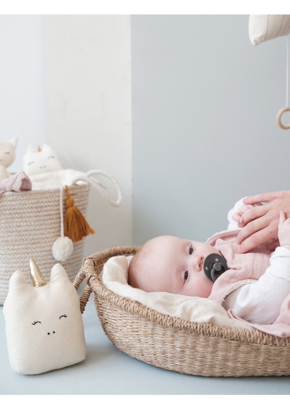 This sweet little musical friend plays Hush Little baby when you pull it's tail. Soft enough to bring to bed, it's the perfect companion to sooth your little one to sleep.