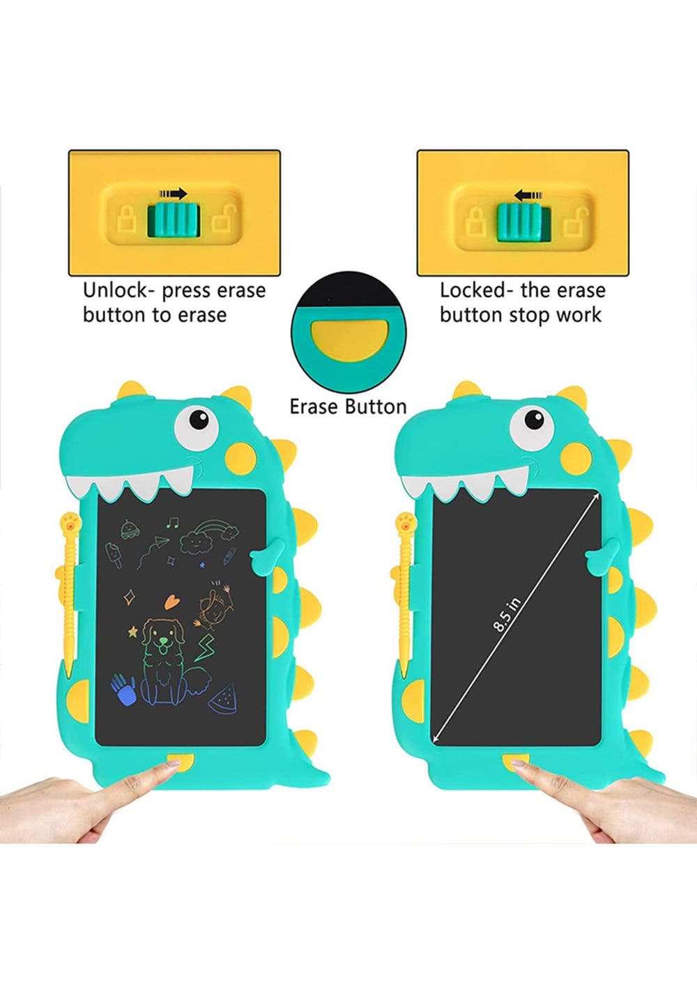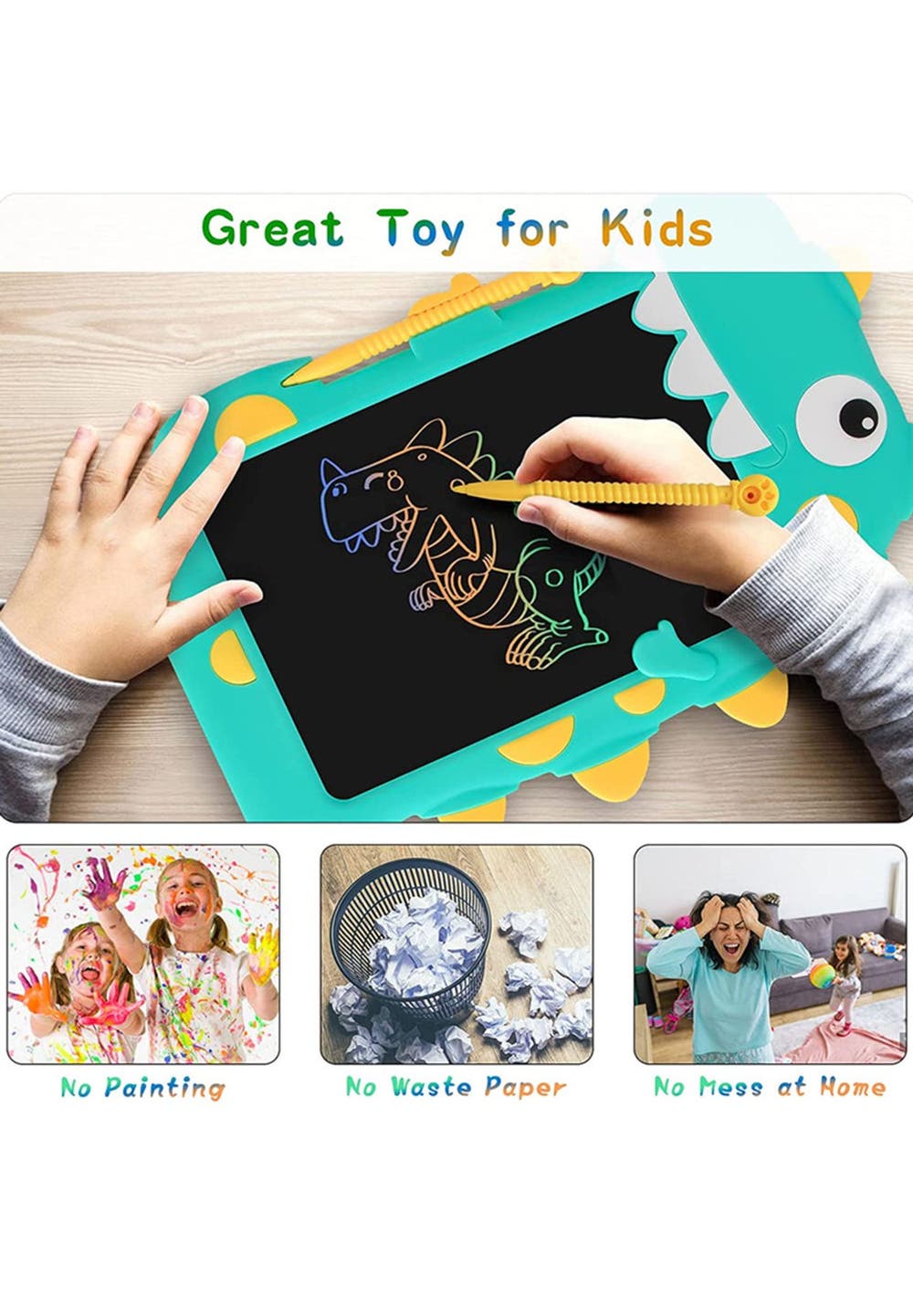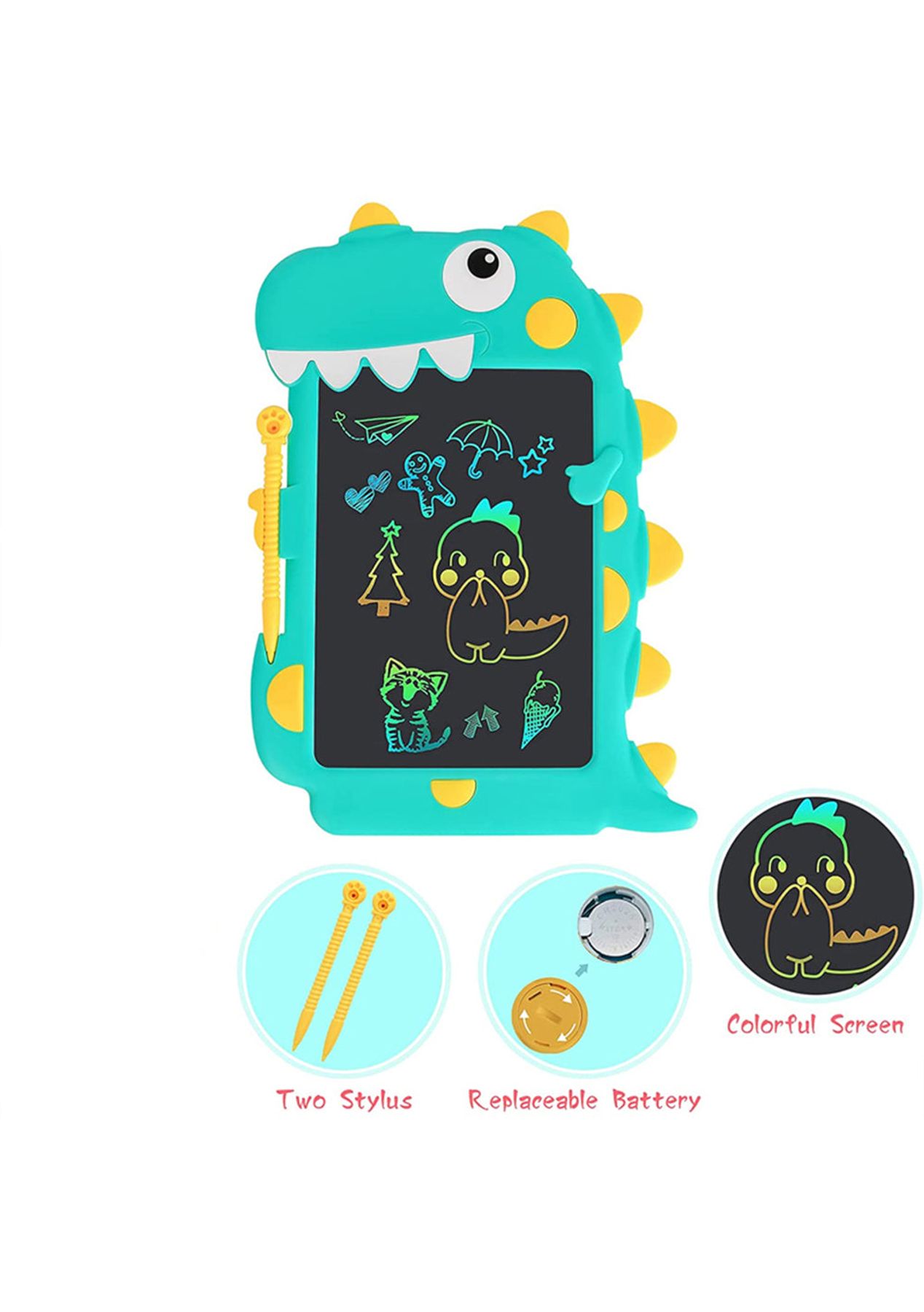 Product Description: This?drawing tablet?comes?with?a cute?dinosaur design that is very attractive to children and is a?great educational and?interactive?toy for children. It is?easy and convenient to use?and is equipped with?an erase button and screen lock function, perfect for unleashing children's imagination and unleash creativity, the colorful and smooth lines will make children play for hours without feeling tired.This kid's LCD writing tablet supports 100,000 times of writing. The thickness of the line depends on how hard you push to meet your drawing needs. No paper waste and no mess at home. Parents can also use this electronic writing pad to teach children math, letters, numbers to enjoy parent-child time.The screen of the notepad is made of high-quality LCD material, with no glare, radiation, dust, or ink. This electronic writing tablet is not self-luminous, and the LCD material relies on external light reflection to display the content so it is very safe and hygienic for children's eyes, safe to use for a long time.This writing board weighs only 150g, can easily be put in daily bags anywhere. Made of durable ABS material, it can certainly withstand accidental drops. No need to charge, the built-in CR2025 battery can be replaced for cycle use.?Product Specification:Color:?Blue, GreenMaterial:?LCD, ABSSize:?28.5*20cmWeight:?150gFunctions:?Drawing tabletBattery Information:?CR2025 (included)?Package Inclusion: 1 * Kids Drawing Pad