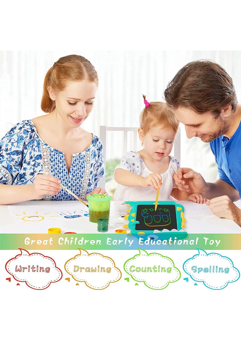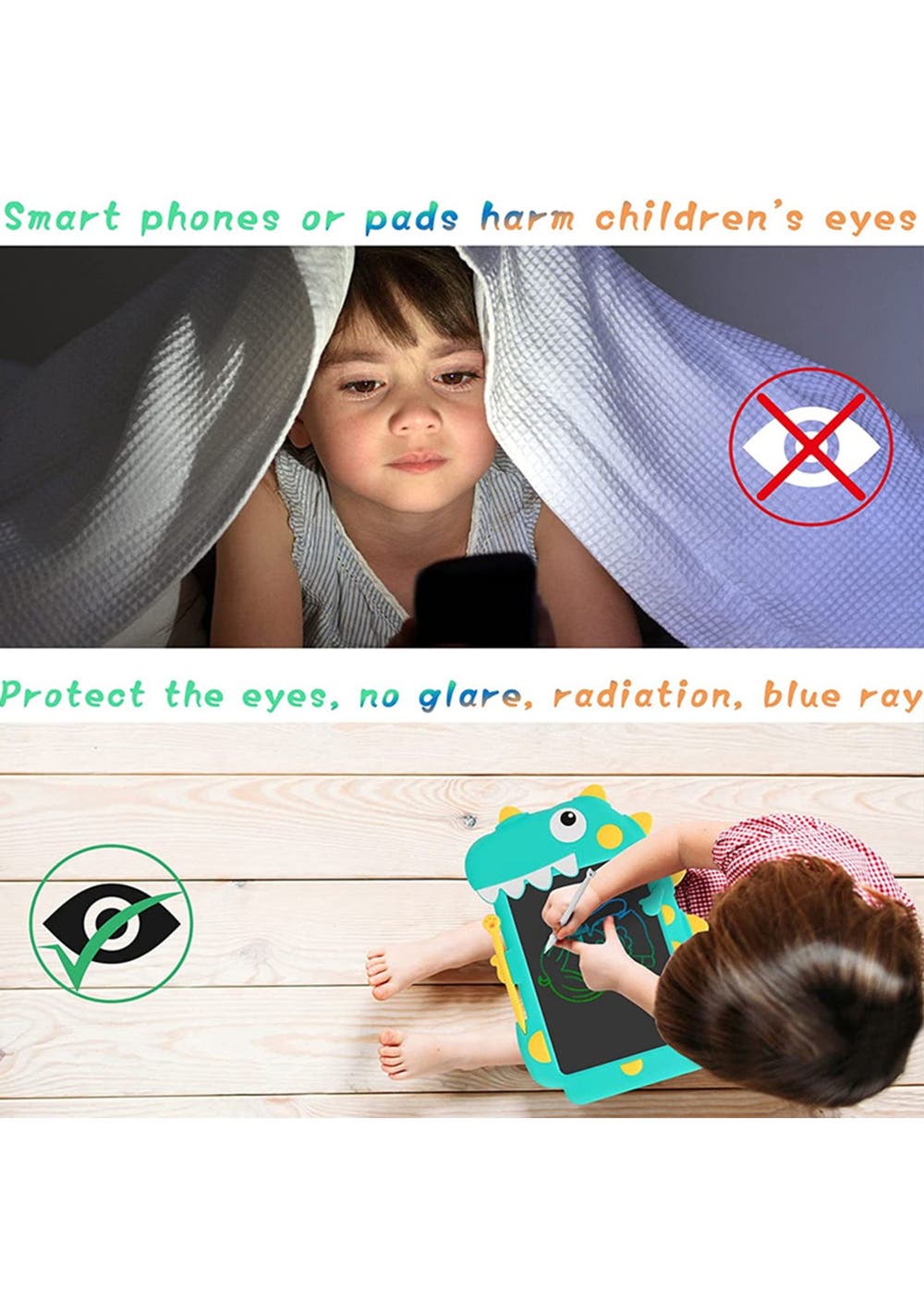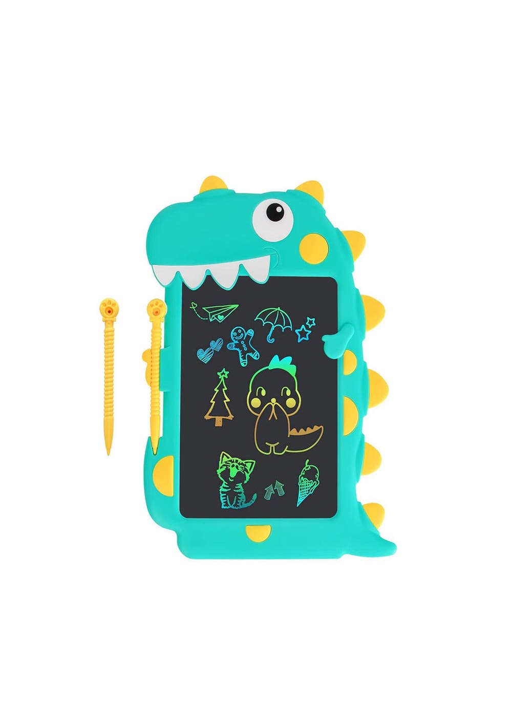 Product Description: This?drawing tablet?comes?with?a cute?dinosaur design that is very attractive to children and is a?great educational and?interactive?toy for children. It is?easy and convenient to use?and is equipped with?an erase button and screen lock function, perfect for unleashing children's imagination and unleash creativity, the colorful and smooth lines will make children play for hours without feeling tired.This kid's LCD writing tablet supports 100,000 times of writing. The thickness of the line depends on how hard you push to meet your drawing needs. No paper waste and no mess at home. Parents can also use this electronic writing pad to teach children math, letters, numbers to enjoy parent-child time.The screen of the notepad is made of high-quality LCD material, with no glare, radiation, dust, or ink. This electronic writing tablet is not self-luminous, and the LCD material relies on external light reflection to display the content so it is very safe and hygienic for children's eyes, safe to use for a long time.This writing board weighs only 150g, can easily be put in daily bags anywhere. Made of durable ABS material, it can certainly withstand accidental drops. No need to charge, the built-in CR2025 battery can be replaced for cycle use.?Product Specification:Color:?Blue, GreenMaterial:?LCD, ABSSize:?28.5*20cmWeight:?150gFunctions:?Drawing tabletBattery Information:?CR2025 (included)?Package Inclusion: 1 * Kids Drawing Pad