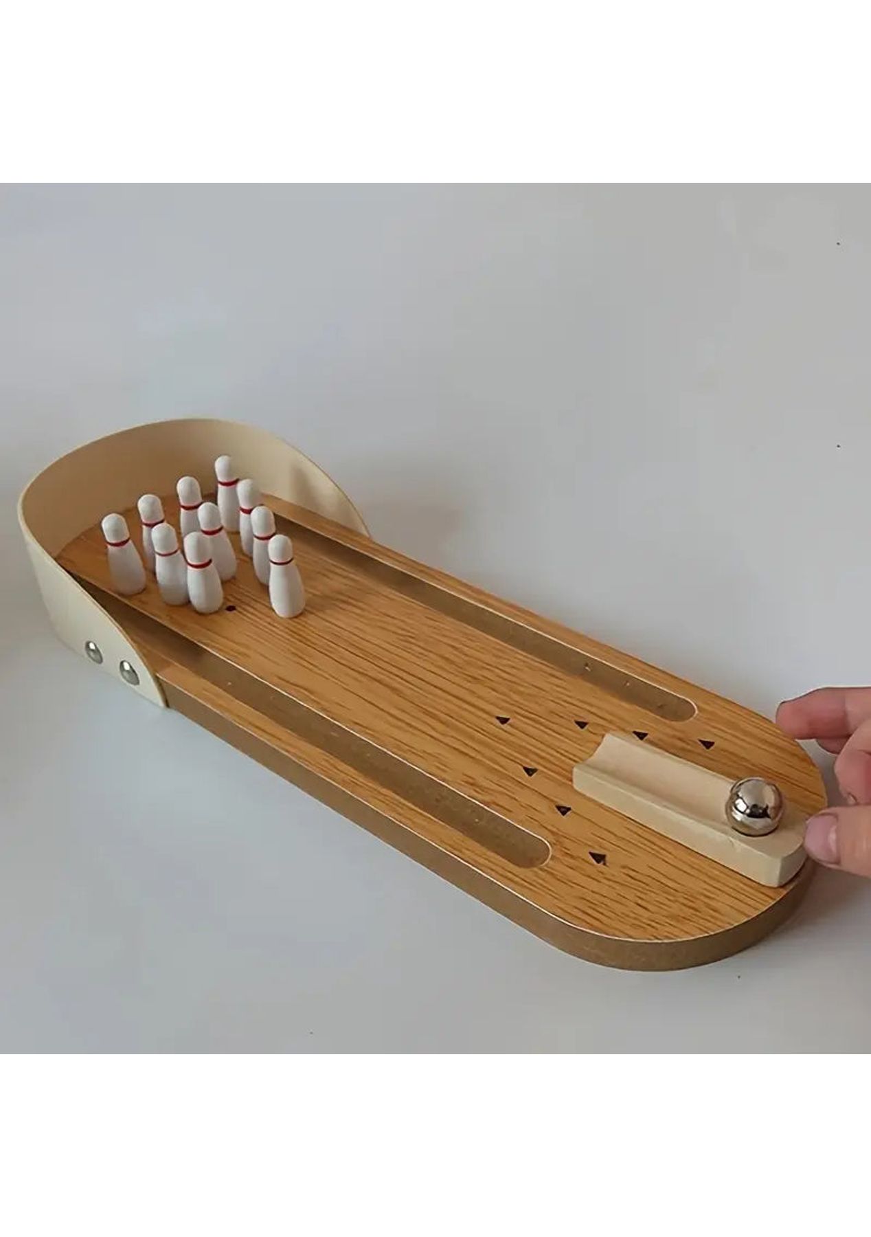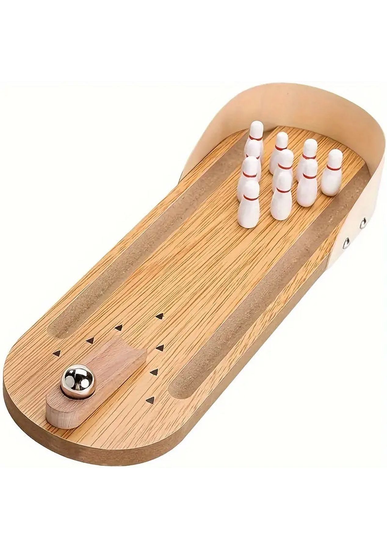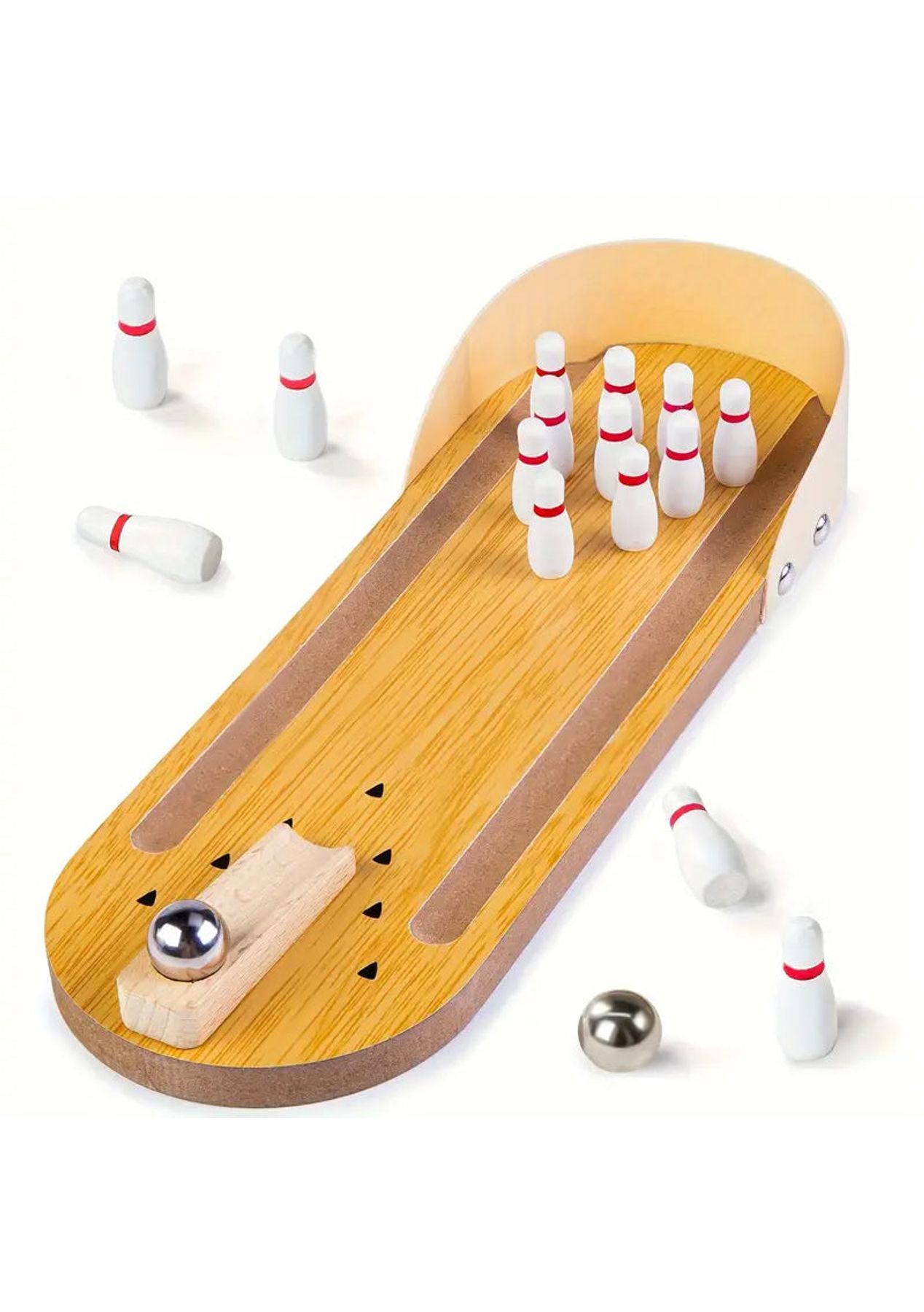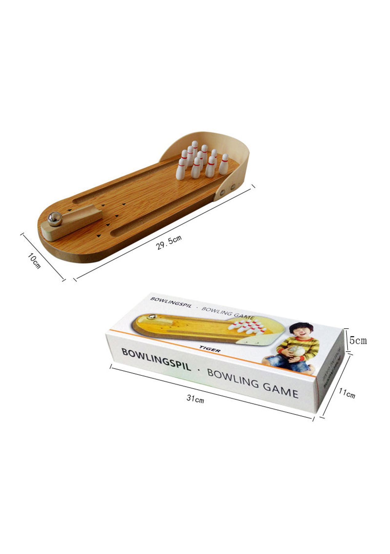 Product Description: The bowling lane, launcher, and bowling pins are made of sturdy wood with non-toxic paint finishes. The ball is made of high-grade metal.?This mini-bowling game is easy to set up and fun to play. Just place the ten mini bowling pins, position the ramp in the desired direction, and then send the ball rolling downThe ramp is moveable to allow for the perfect strike. Let the good times roll anytime and anywhere as it is small and compact to carry with you wherever you go, it is suitable for indoor or outdoor use.?Product Specification:Color: WoodenMaterial: PlasticSize: 10 x 29.5 cmWeight: 400gFunction: Interactive ToyPackage Inclusion:1 x Wooden Base10 x Bowling Pins1 x Ramp1 x Stainless Steel Ball