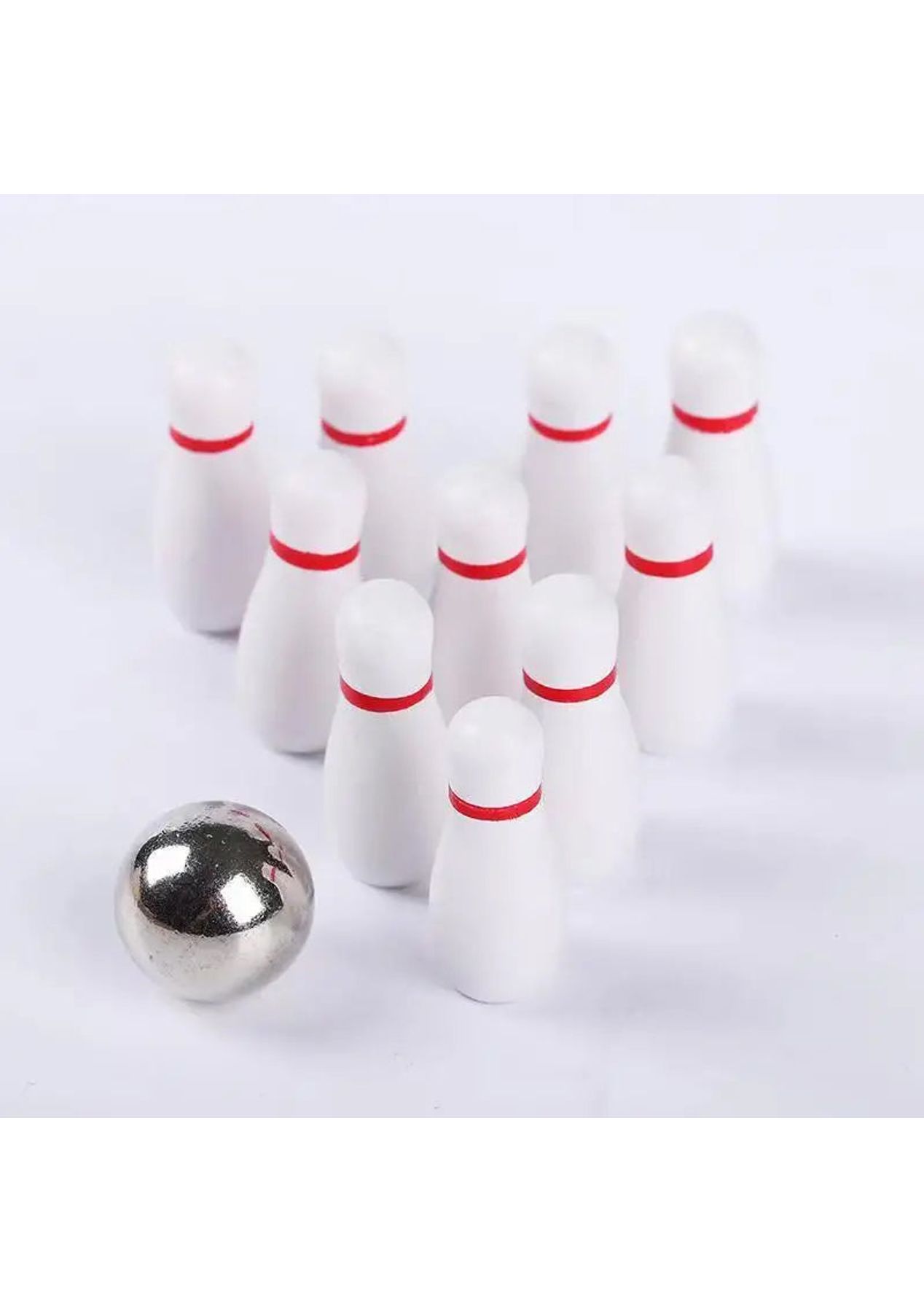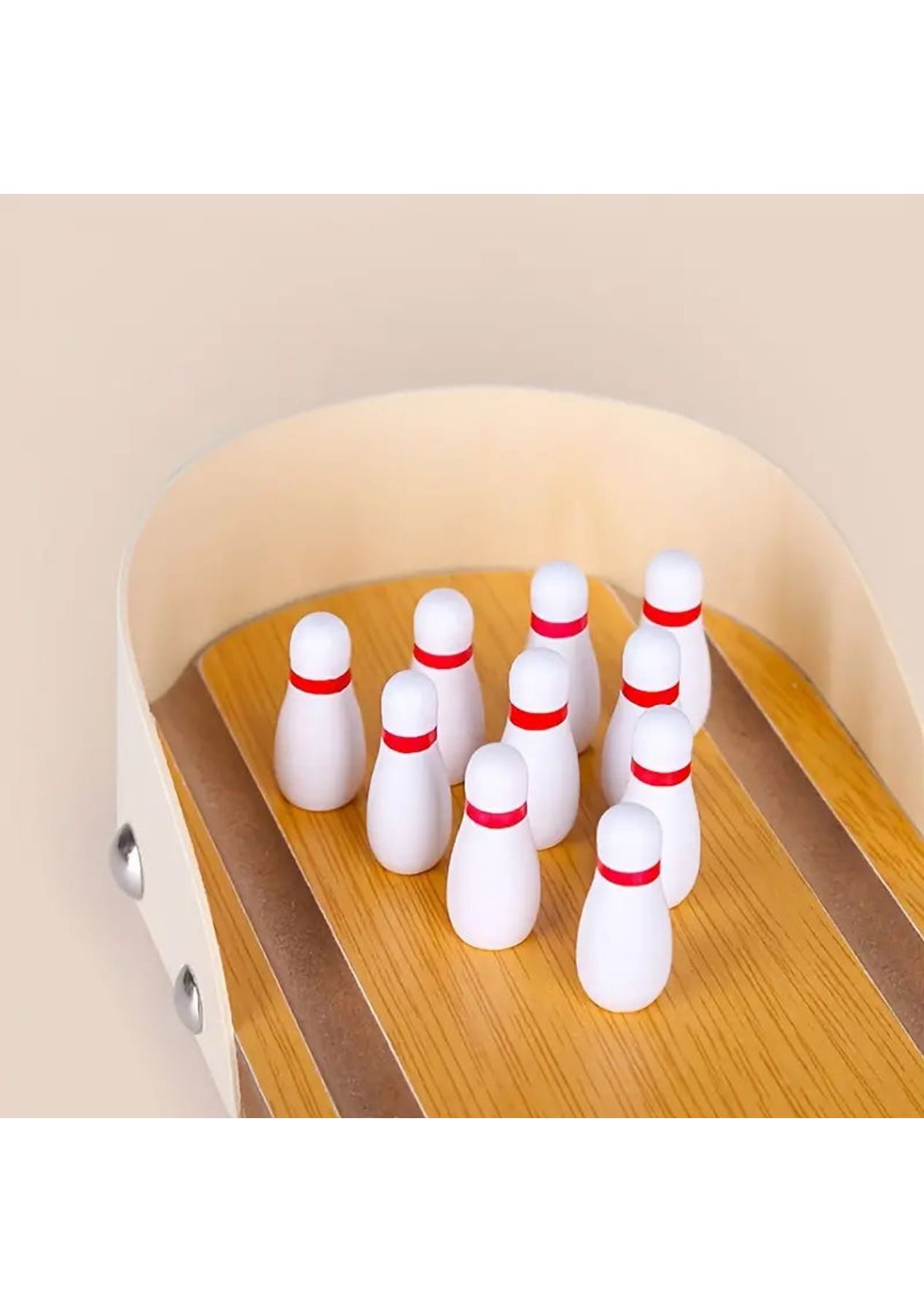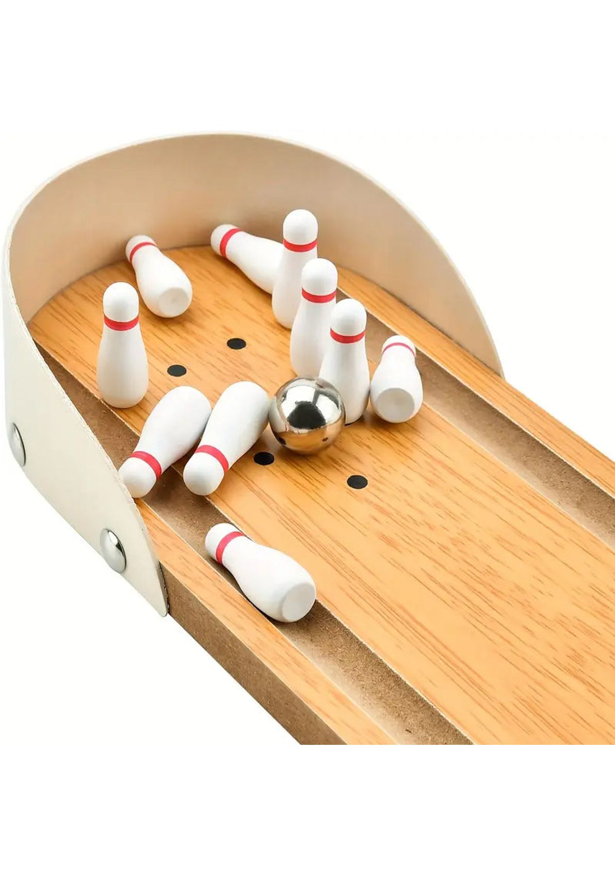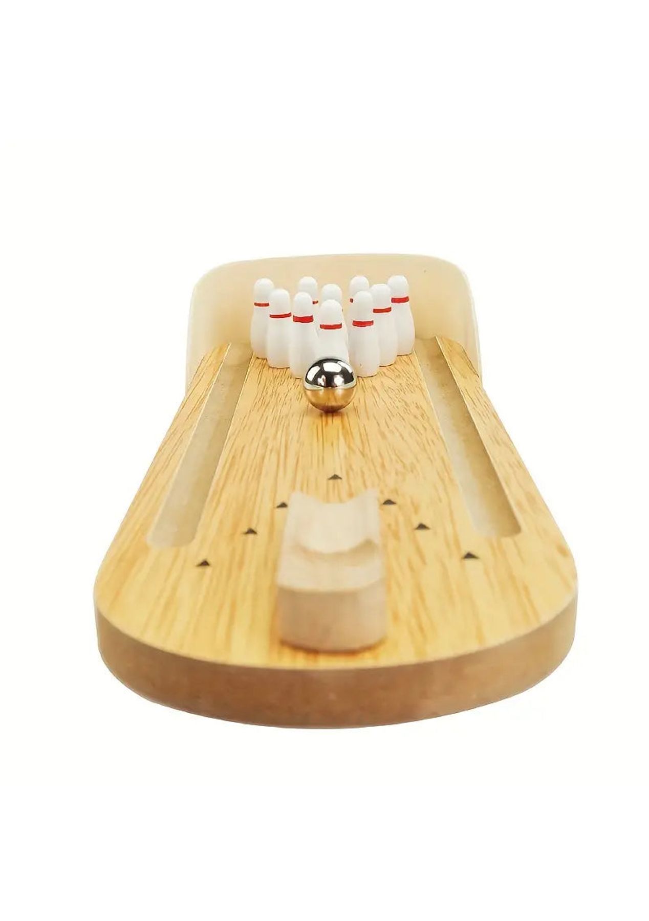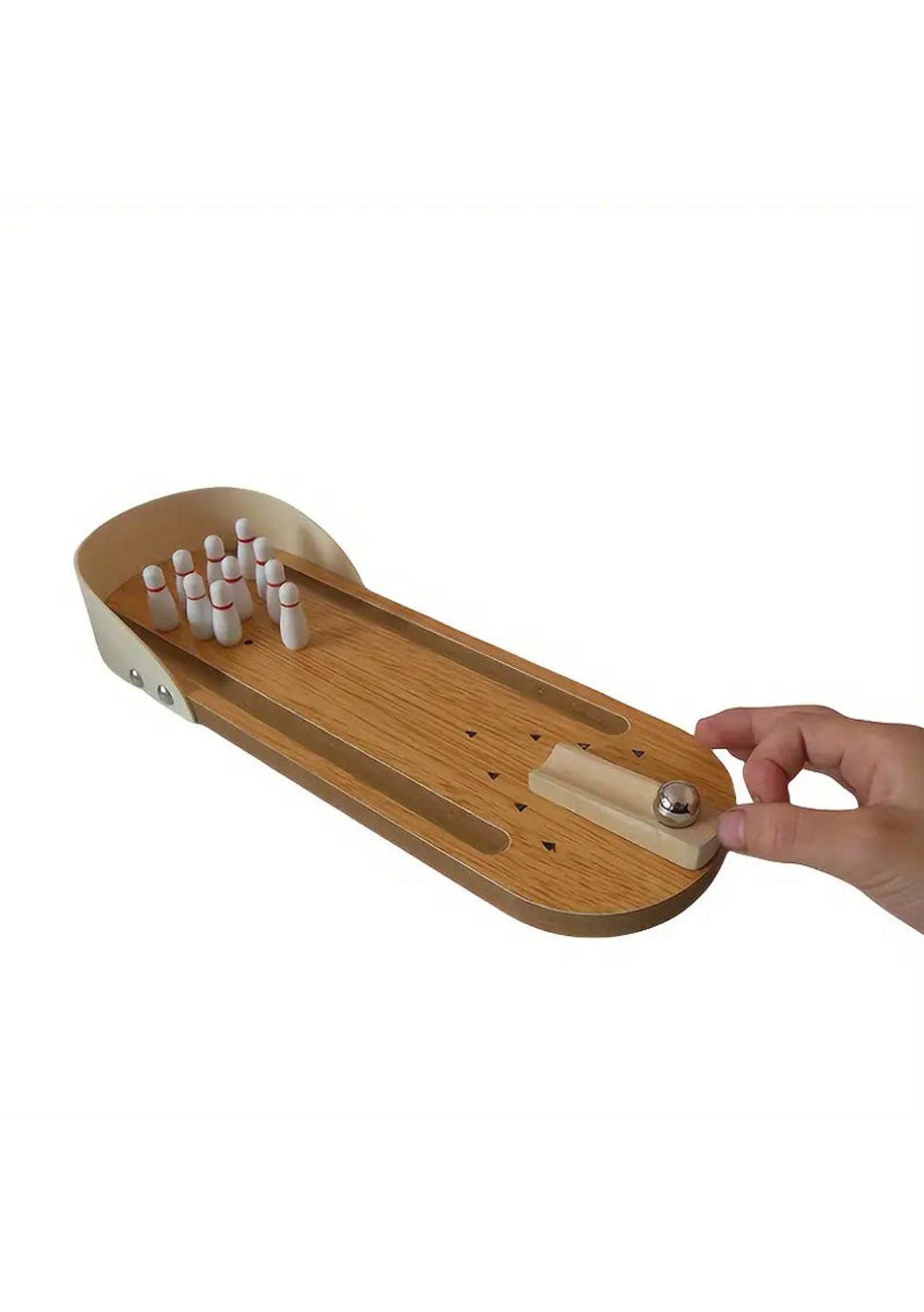 Product Description: The bowling lane, launcher, and bowling pins are made of sturdy wood with non-toxic paint finishes. The ball is made of high-grade metal.?This mini-bowling game is easy to set up and fun to play. Just place the ten mini bowling pins, position the ramp in the desired direction, and then send the ball rolling downThe ramp is moveable to allow for the perfect strike. Let the good times roll anytime and anywhere as it is small and compact to carry with you wherever you go, it is suitable for indoor or outdoor use.?Product Specification:Color: WoodenMaterial: PlasticSize: 10 x 29.5 cmWeight: 400gFunction: Interactive ToyPackage Inclusion:1 x Wooden Base10 x Bowling Pins1 x Ramp1 x Stainless Steel Ball