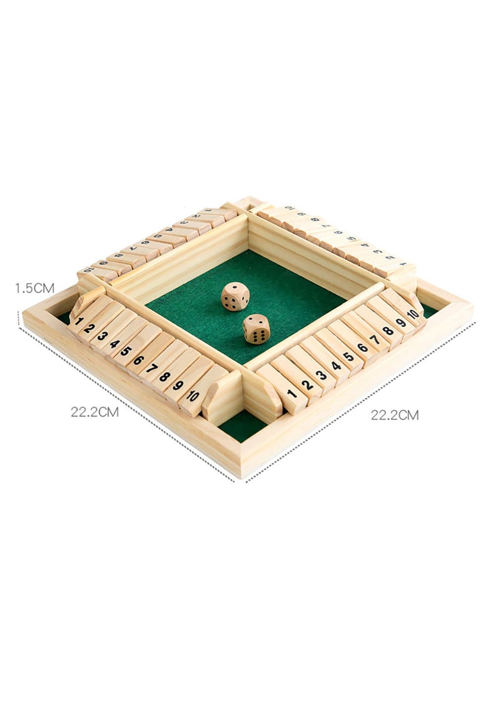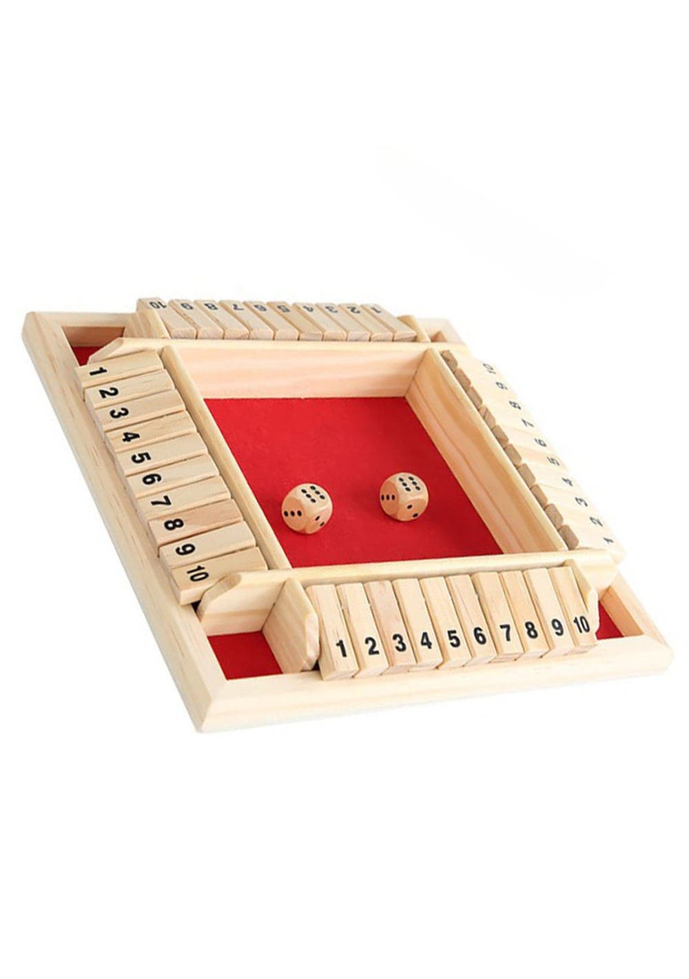 Product Description: This shut the box is made of natural hardwood that is very smooth, delicate, no odor and chemical composition. The bottom of the box is covered with a green soft felt surface.?High quality wood and solid structure make this shut the box very durable, we added 2 extra dice in the package to avoid being unable to use due to the loss of dice.?Each board prints number clearly, each player owns 10pcs of board number from 1 to 10; roll the dice and lay down tiles that match the sum of the roll dice numbers. In addition, you can customize the detailed rules of the game.?Great for Learning Number Operations, Perfect for kids and adults at home, parties and outdoor activities, not only can create a fun atmosphere but also increase the friendship between players.?1-4 player games for people of all ages, you can play with your children, parents, colleagues and friends.??Product Specification:Color: Green, RedWeight: 400gMaterial: WoodSize: 22.5 x 22.5 x 1.5 cmFunction: Kids & Adults Fun Board GamePackage Inclusion:1 x Shut the Box Dice Game Board?