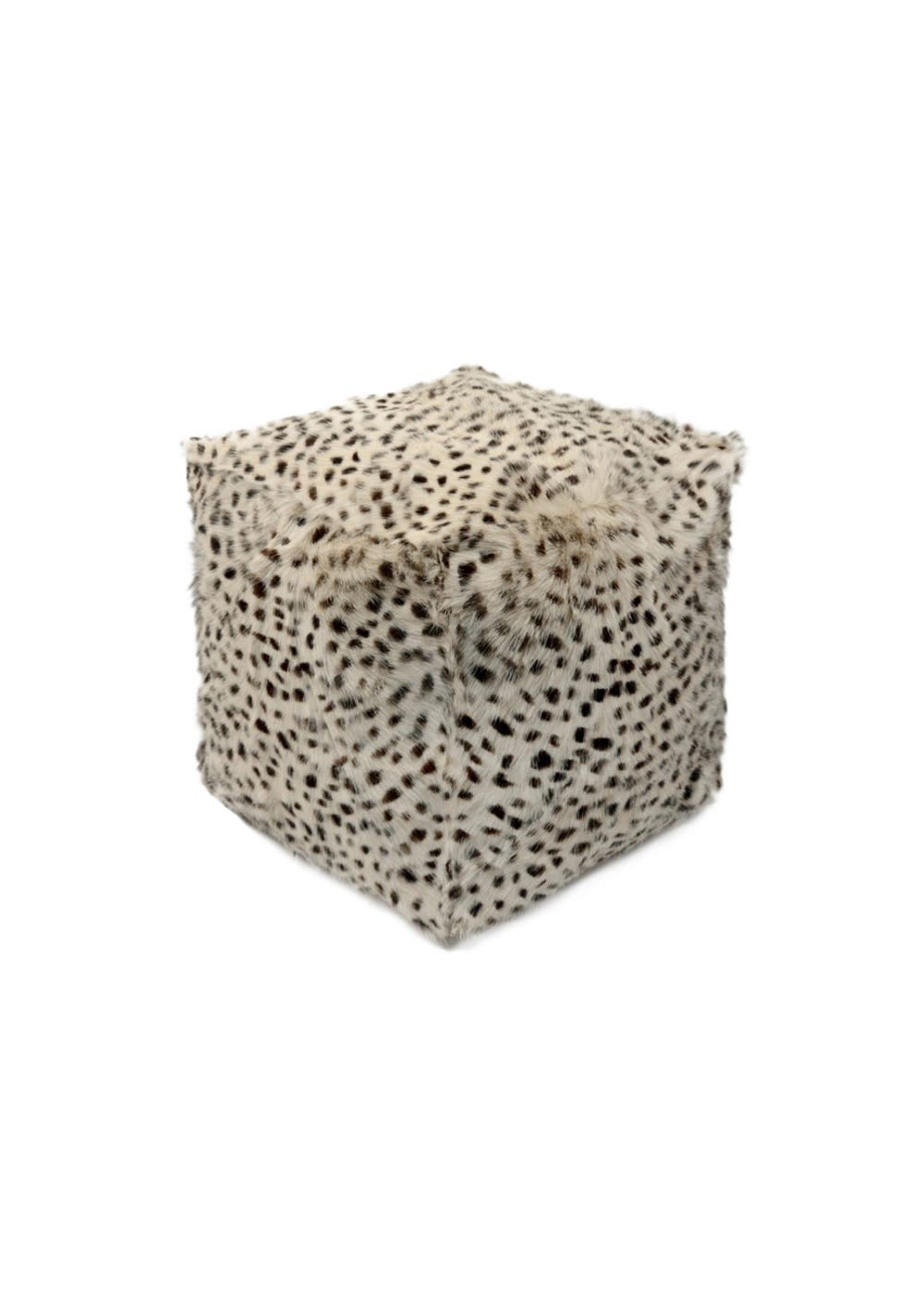 GOAT FUR POUF LEOPARD 40 X 40 X 40CMSize: 45 X 45 x 40CMFront:100% Fur, Back: 100% Polyester, Filling: 100% PolybeanDRY CLEANING ONLY. Fur may be subject to natural fading when exposed to sunlight.