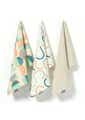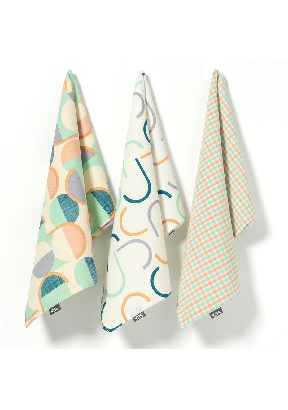 Hand painted in their Australian studio, KAS introduces their Mari pattern. Featuring art deco inspired geometric half shapes. This three pack tea towel set includes two placement printed options and one check woven option. 50x70cm. 100% Cotton. Machine Washable. Made in India.