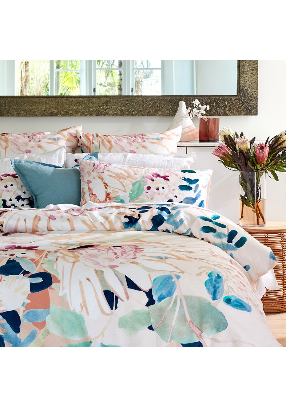 Pretty and feminine, Milton depicts a handpainted watercolour garden scene with delicate blooms and large scale proteas. With soft pastel tones and pops of teal throughout, Milton is digitally printed onto a pure cotton 250thread fabric. Coordinating European pillowcases are avaialble to complete the look. Packaged in a self fabric bag. 100% Cotton. Made in China. Product my vary slightly from that illustrated.