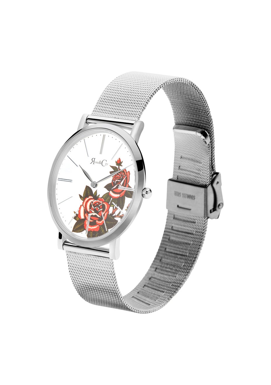 Rose & Coy Women's Quartz Pinnacle Watch, features a captivating 40mm red rose dial. Encased in a sleek silver case and paired with a sophisticated silver mesh strap, this timepiece exudes elegance and modernity. The minimalist analog display enhances its timeless charm, while the stainless steel strap ensures durability and comfort. Perfect for any occasion, this watch is a stunning blend of artistic beauty and refined craftsmanship, making it a standout accessory for the discerning woman.