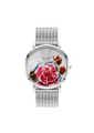 This ultra-slim 40mm timepiece features a delicate pink rose design on the dial, beautifully encased in a sleek silver setting. The sophisticated silver mesh strap offers both comfort and modern style, while the minimalist analog display enhances its timeless appeal. Crafted with precision and artistry, this watch is the perfect accessory to add a touch of floral charm and refined elegance to any outfit.