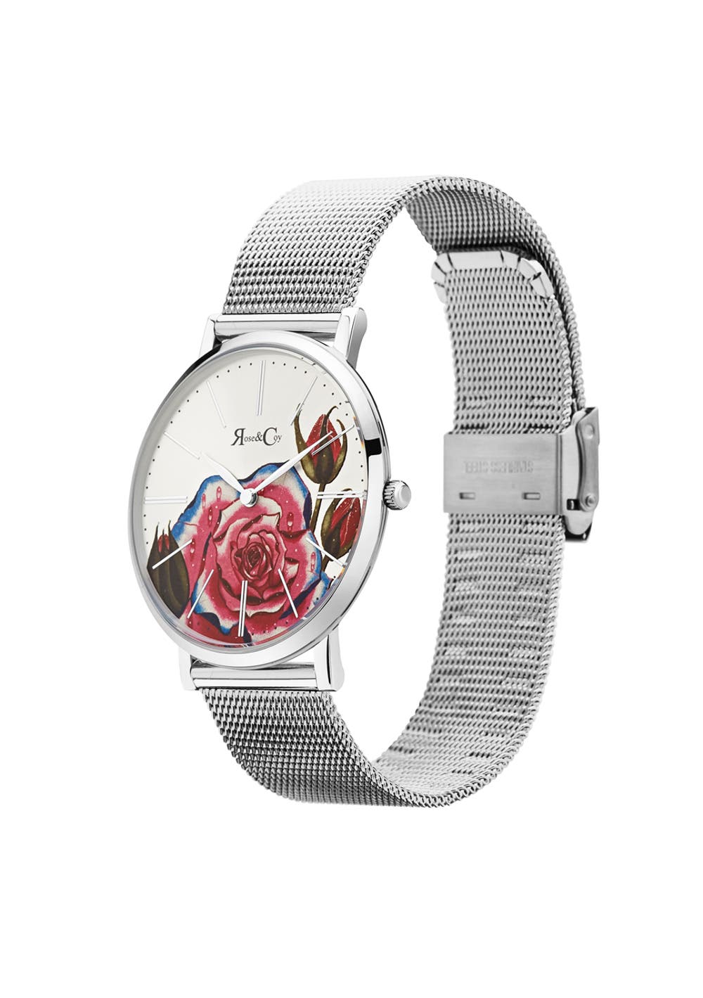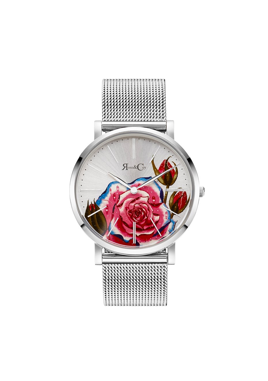 Rose & Coy Women's Quartz Art Series Pink Rose Ultra Slim 40mm Silver Mesh Strap Watch analog Display and Stainless Steel Strap