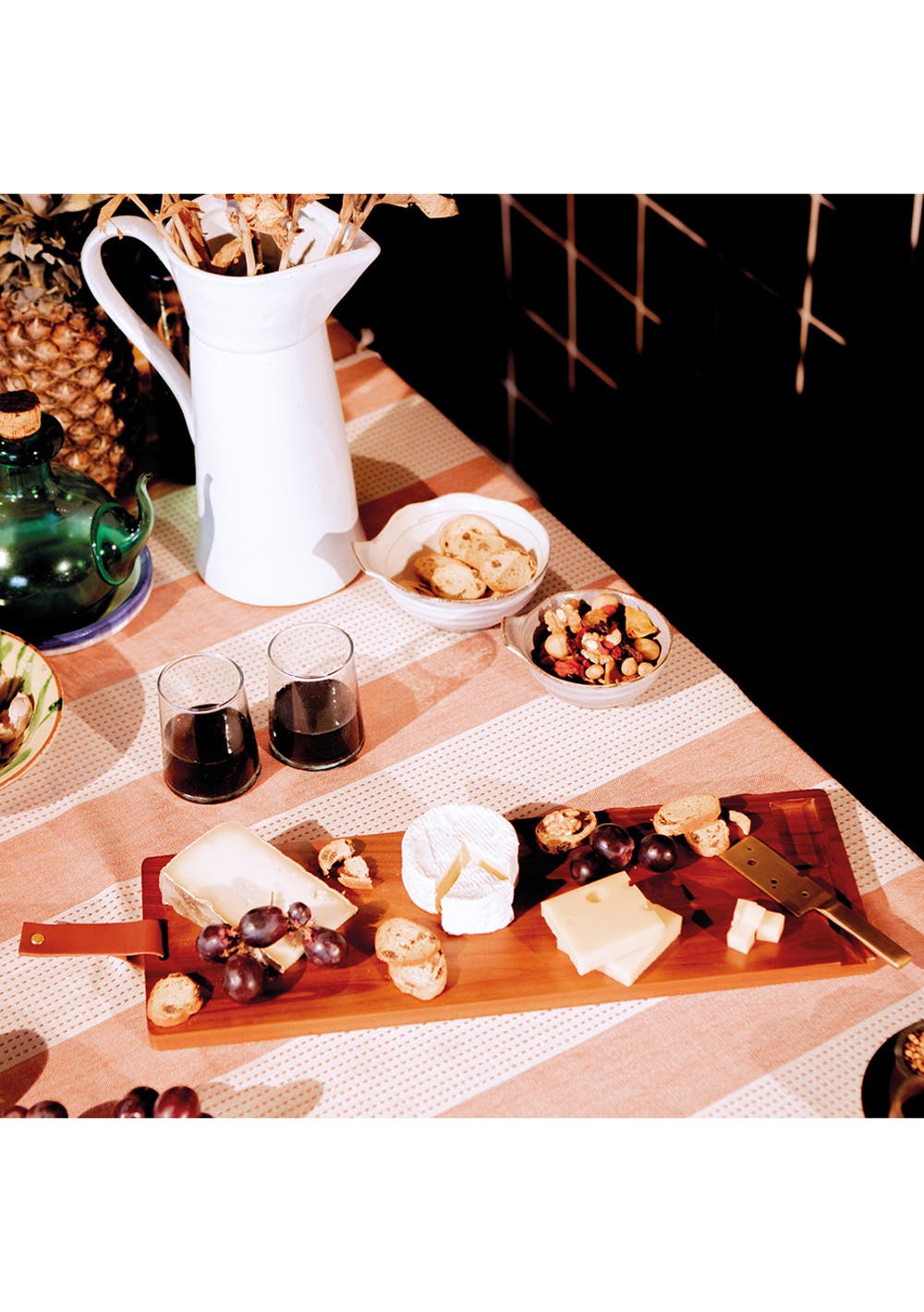 Unique acacia wood cheese cutting board with cheese-inspired knife.