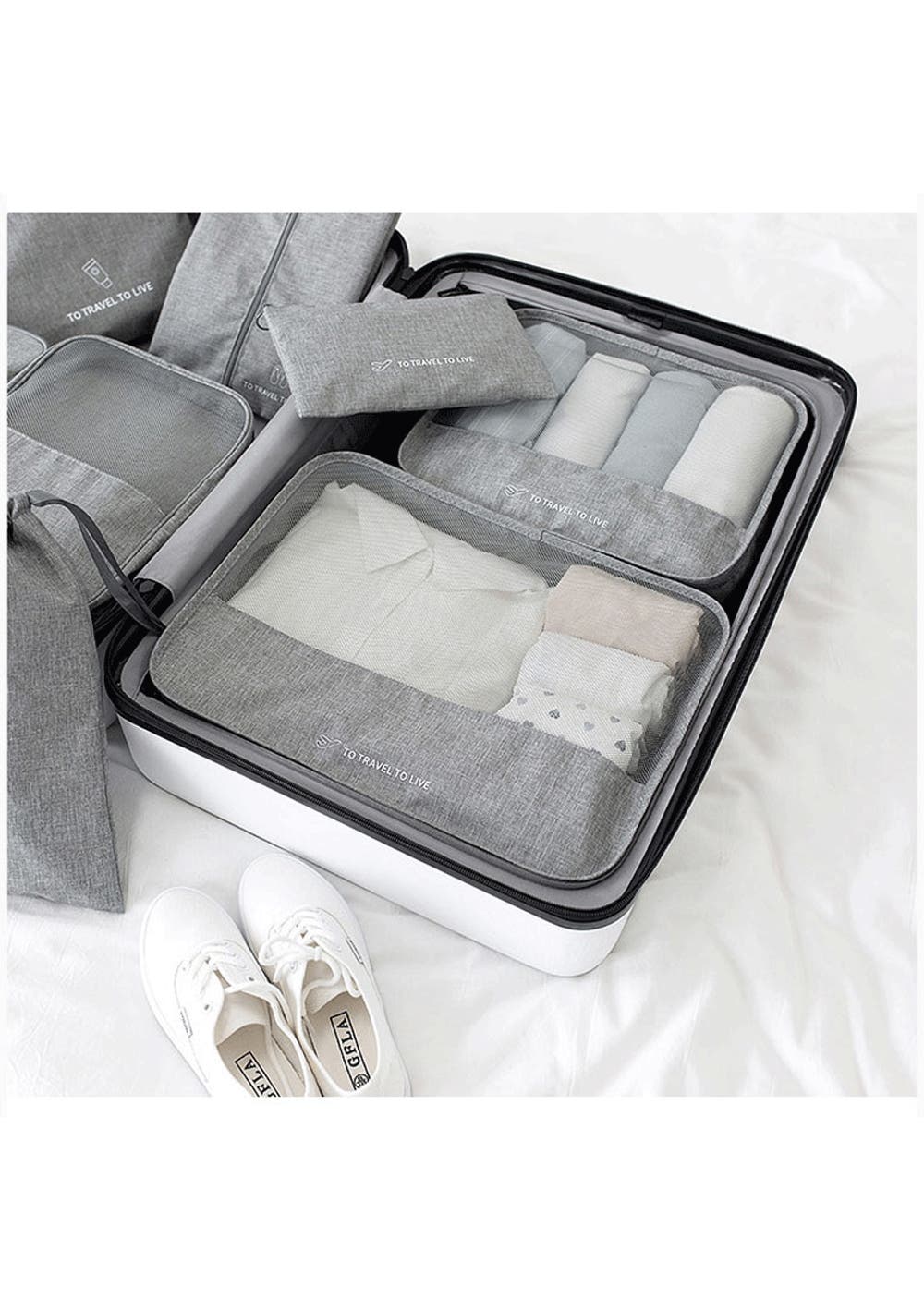 Travel Storage Luggage Organizer Pouch Set of 7 Pink Product dimensions (LWH): 3 Packing Cubes :L 41.5x 32x11cm M 34x28x11cm S 31x20x11cm 1 Underwear Bag: 25.5x16cm 1 Shoes Bag:20x33.5cm 1 Laundry Bag: 25.5x34cm 1 Makeup pouch: 27.5x24cm Package dimensions (LWH):30 x 35 x 3cm Weight:400 g Features  The pouch does not mess up in your suitcase, so it can save much space, so it is very useful for separating underwear, pajamas, cosmetics, clothing, etc., and you can see your trunk neat and organized  Separate and store different clothes or spouse's clothes, make your suitcase neat, clean, neat and tidy and enjoy your travel mood.  Packing the cube for your suitcase will save your luggage/bag space and help you to classify your belongings.  HIGH QUALITY: Packed with reusable, easy to clean and carry, made of high quality polyester cloth  LARGE CAPACITY: Store and organize all your clothes, lingerie, bra, shoes, toothbrush, towels, toiletries, electronic accessories  Design: The durable handle design makes it easy to carry your travel bag. Or you can fold it up and carry it in your bag or backpack  Package Include  1 x Travel Storage Luggage Organizer Pouch Set of 7