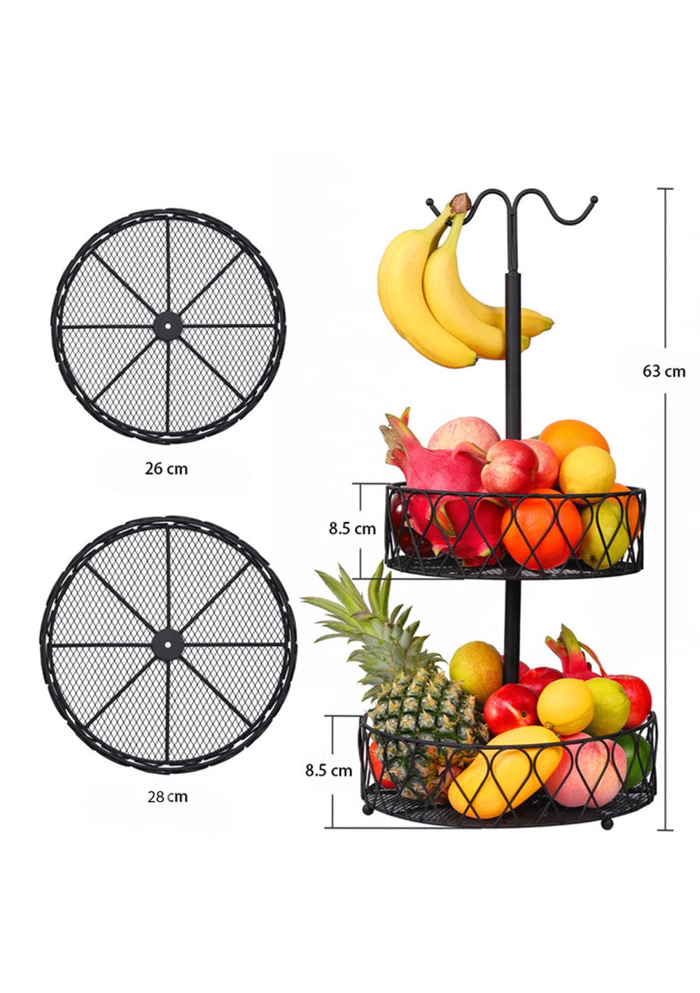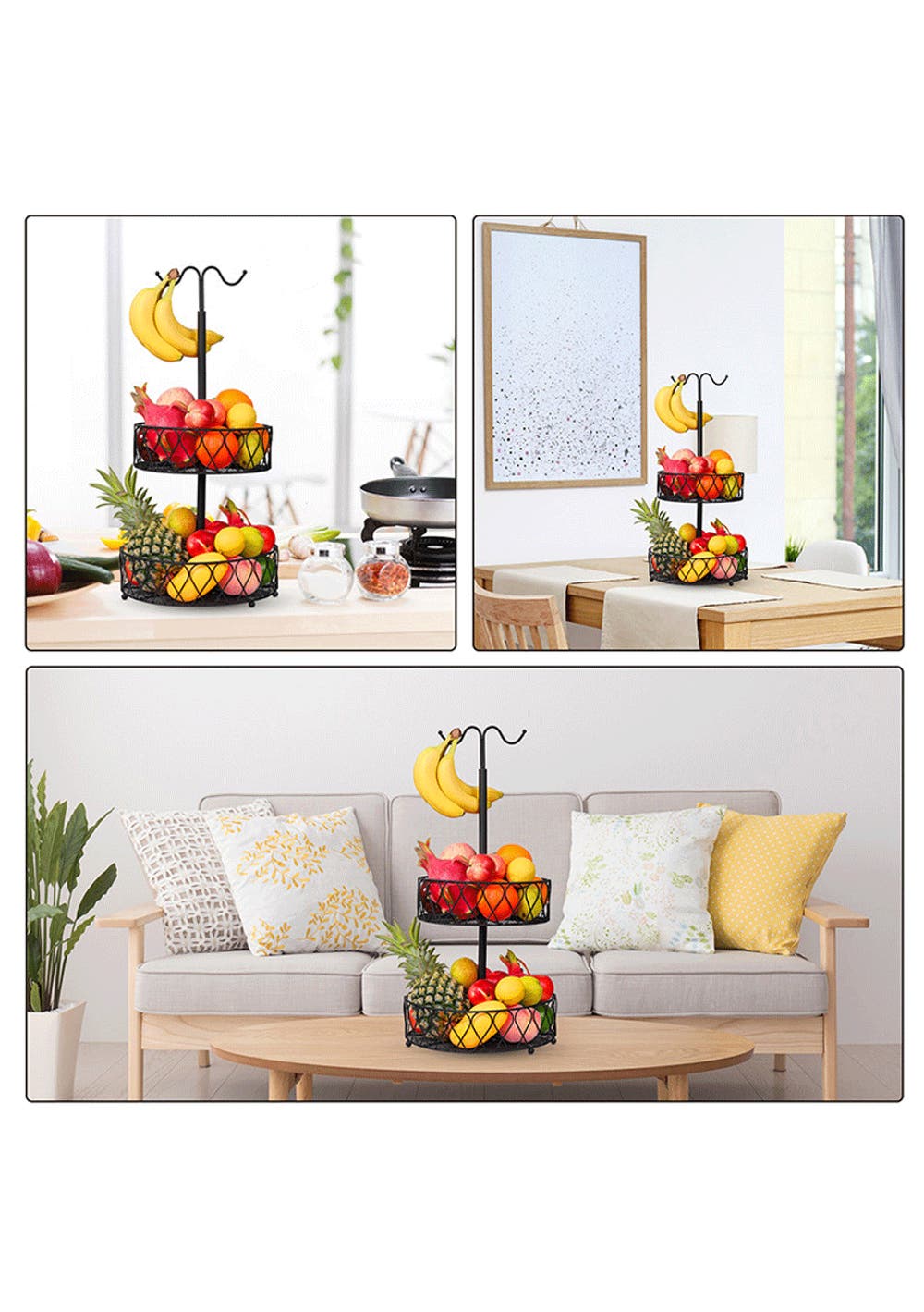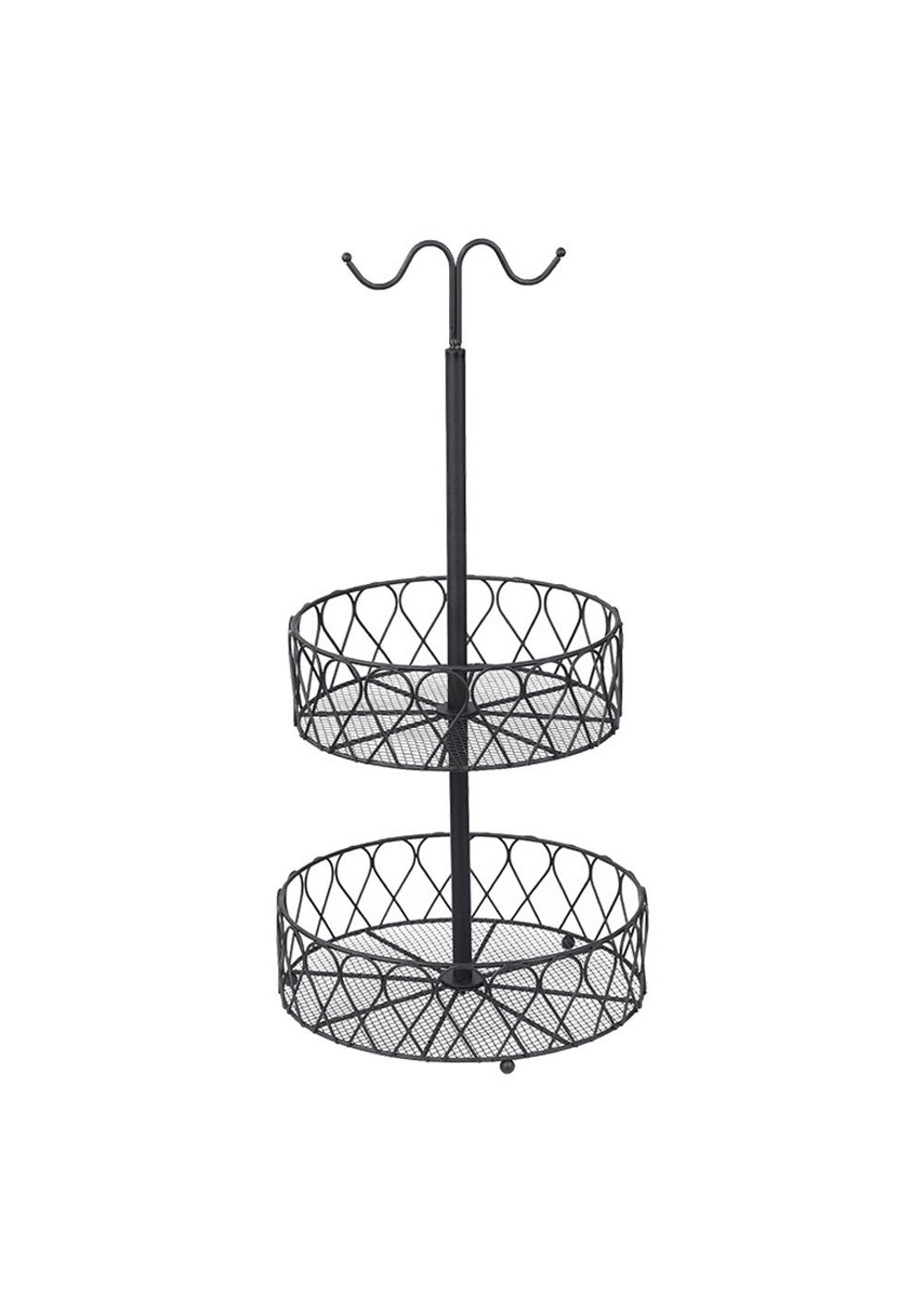 DETACHABLE FRUIT BASKET - Use the baskets in a stacked 2-tier arrangement or use them as two separate baskets, one with a handy banana hanging hook.