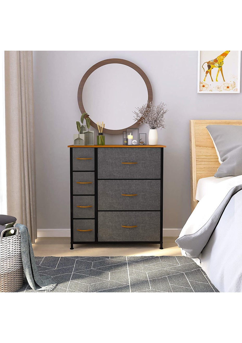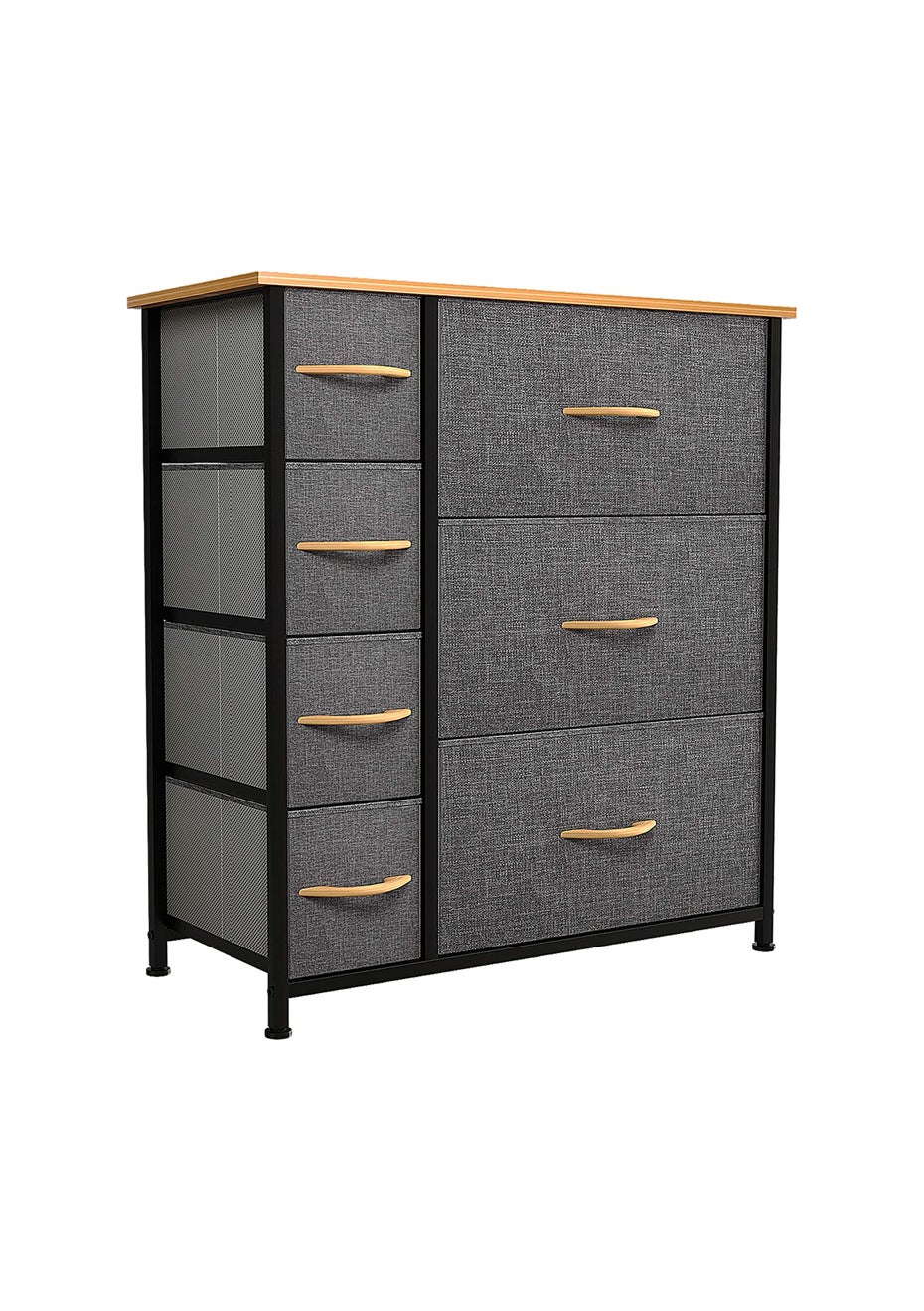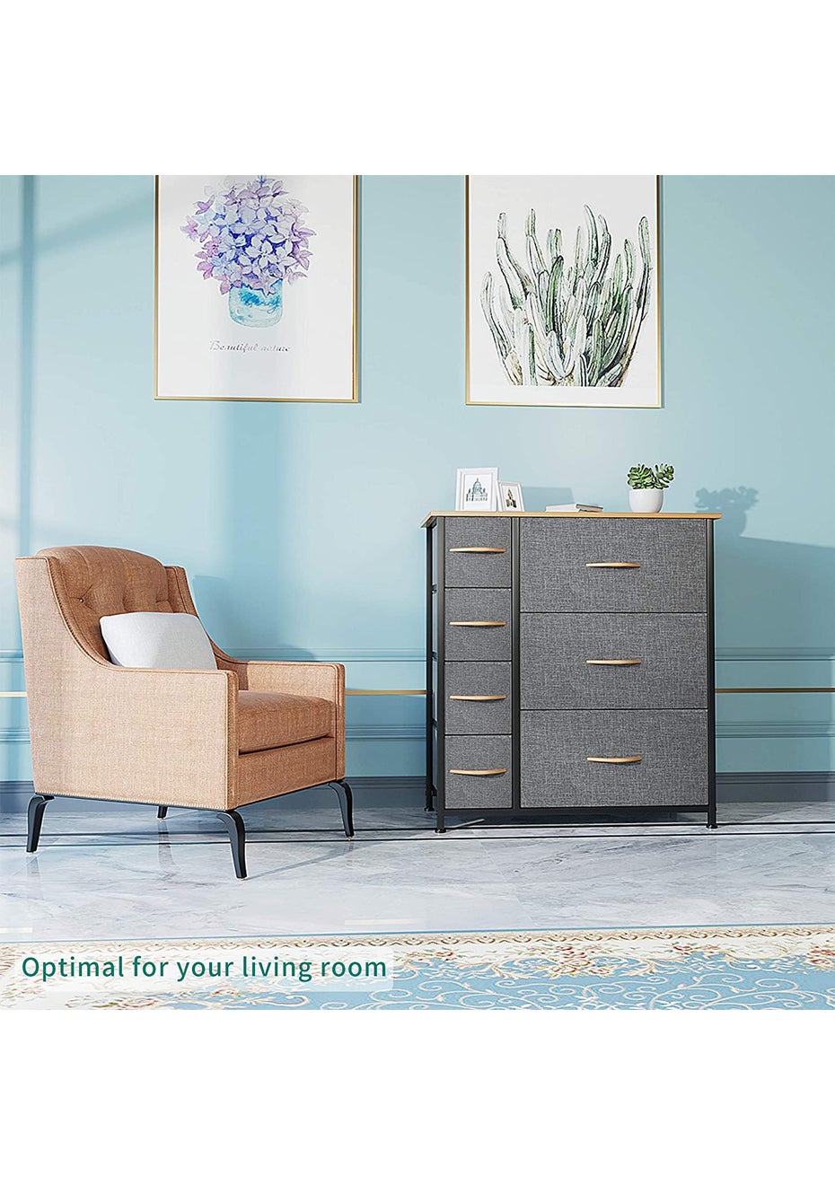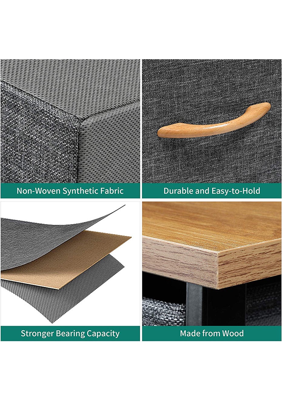 Premium cool grey fabric drawers, with sturdy black metal frame and waterproof wooden tabletop; Enjoy modern scent and stylish aesthetics that easily complements various living spaces: living rooms, bedrooms, hallways, entryways, closets and nurseries, etc.