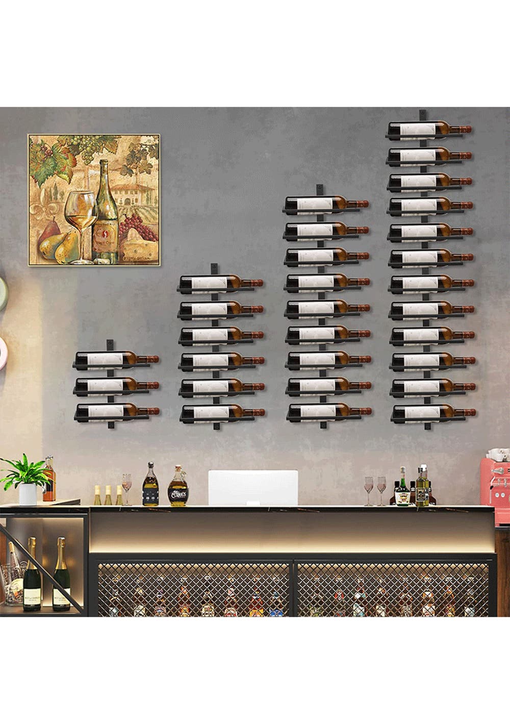 Space Saving Design, This wall mounted metal wine rack provide a storage solution for a wide range of height and bottle size. No more bulky shelves and taking too much space.