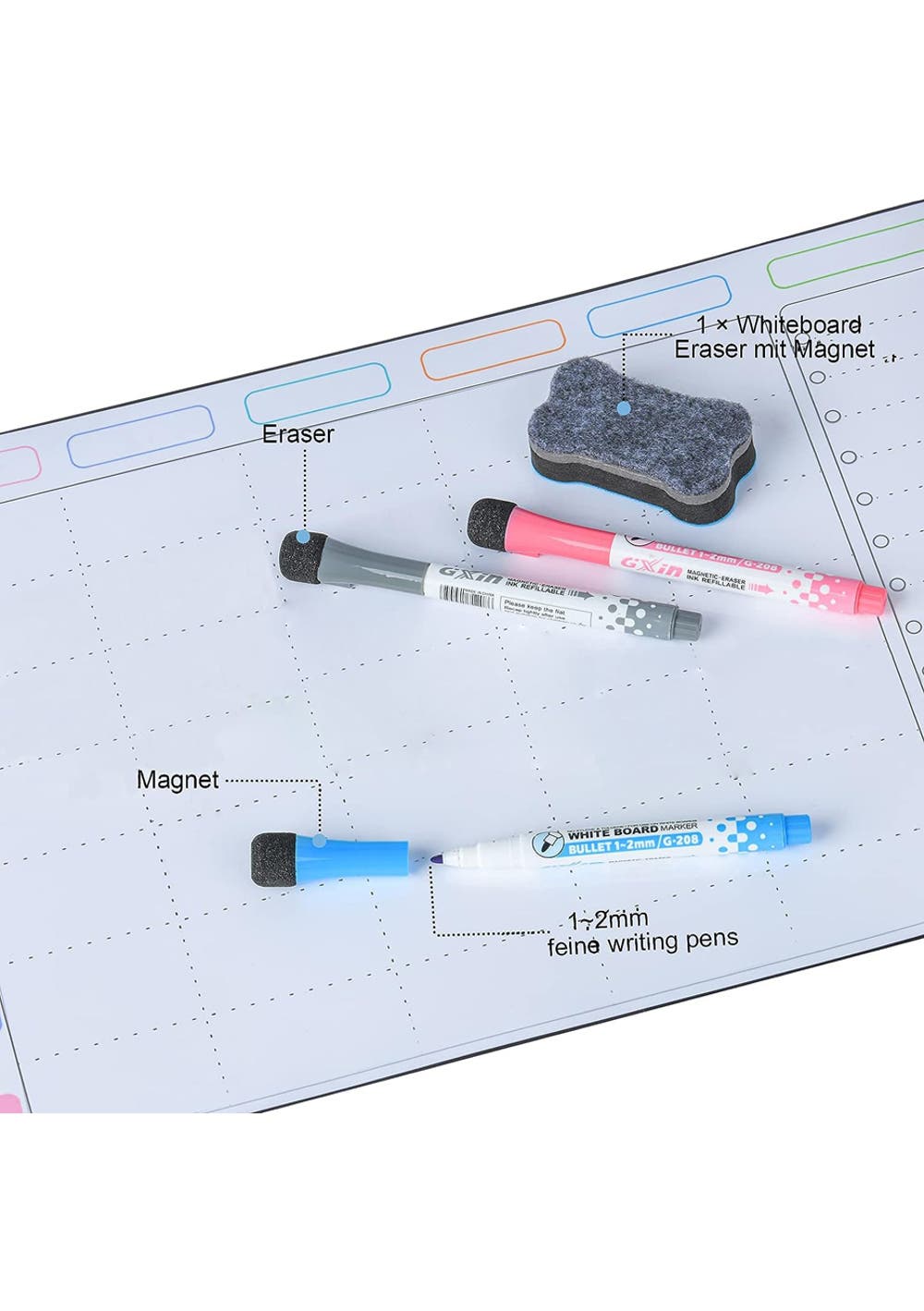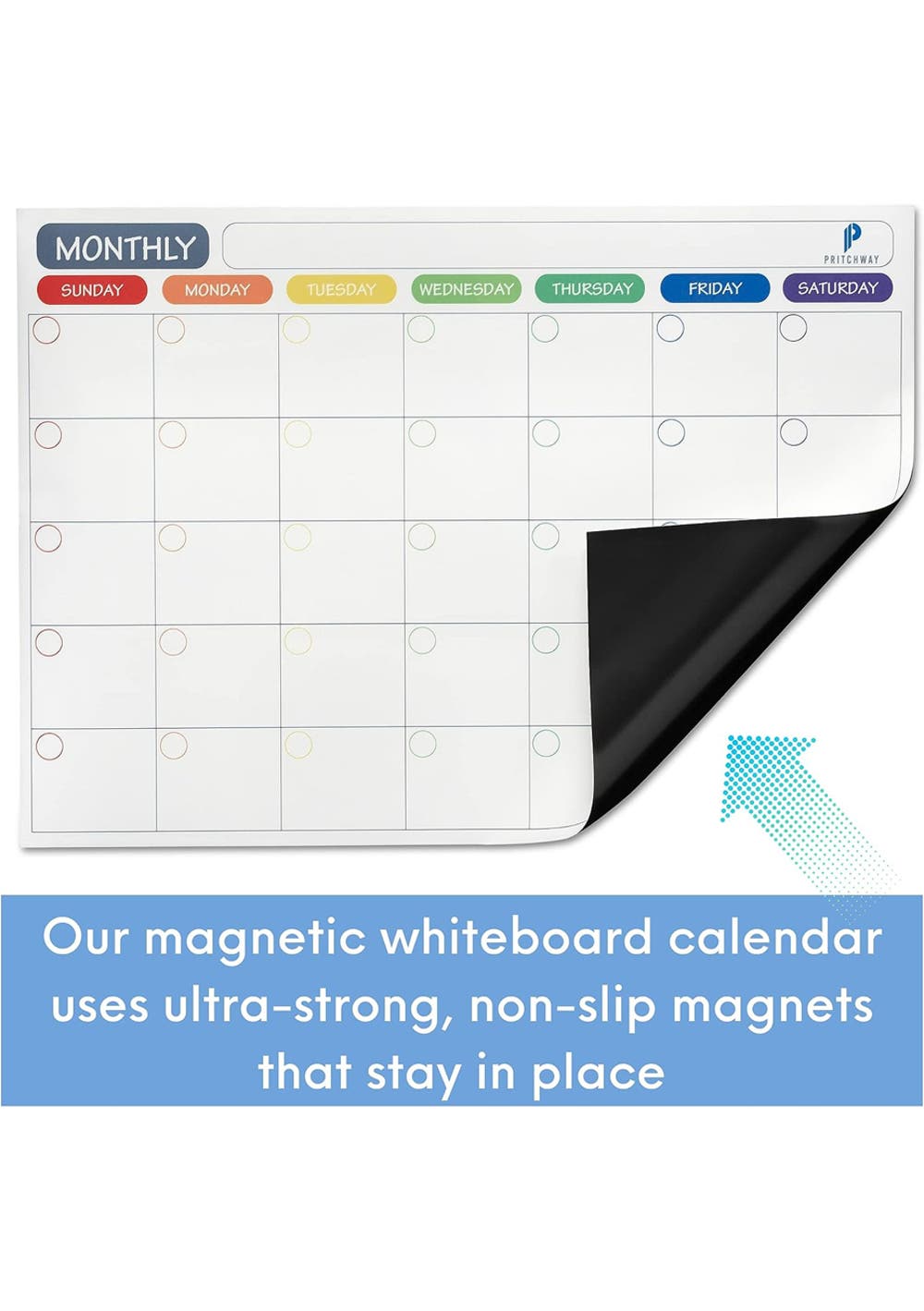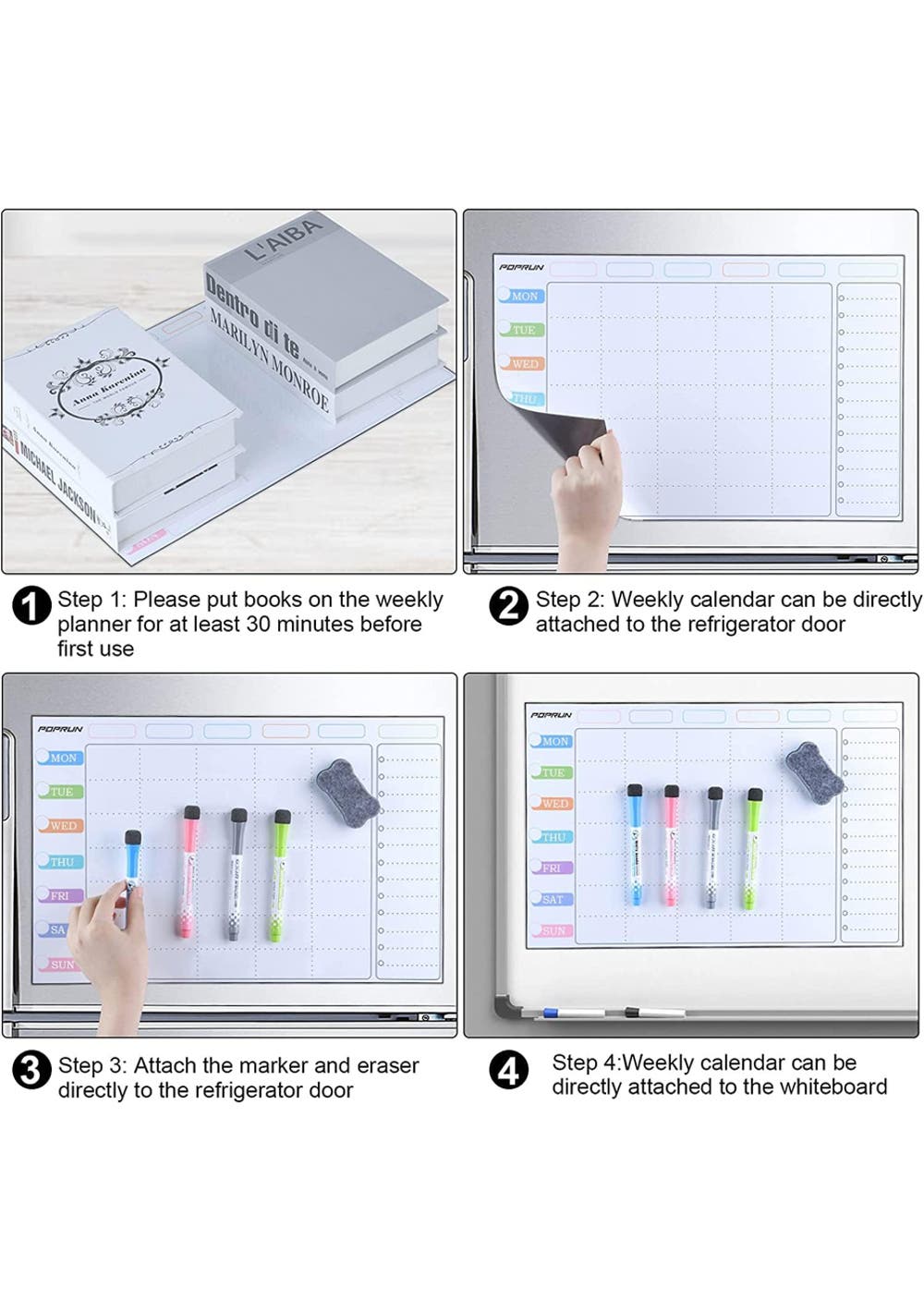 Monthly Fridge Calendar Whiteboard with Marker & Eraser<br>Material: PP<br>Product dimensions (LWH): 30 x 42 cm<br>Package dimensions (LWH): 34x5x5cm<br>Weight: 285g<br>Please put books on the weekly planner for at least 30 minutes before first use<br>Features:<br>• Robust Magnetic Calendar: Crafted with a thick and durable fridge calendar plate that's tear-resistant, this whiteboard calendar promises longevity. Unlike other flimsy calendars that fall off, this one stays securely on your fridge, always looking smooth without bubbles or bends.<br>• Versatile Application: More than just marking dates, this magnetic calendar whiteboard serves multiple purposes. Whether you need a meal planner, shopping list, family event planner, or an academic schedule, it fits every need. Perfect for home, office, kitchen, classroom, or even the dorm room.<br>• Organized Life: The monthly erasable schedules are perfect for jotting down tasks, meals, or anything you need to remember. With designated columns and ample space for notes, it acts as a visual to-do list that not only helps you stay on track but also gives a satisfying sense of accomplishment.<br>Package Content:<br>• 1XMagnetic Dry Erase Calendar Monthly Board<br>• 3XFine Point Markers<br>• 1XMagnetic Eraser