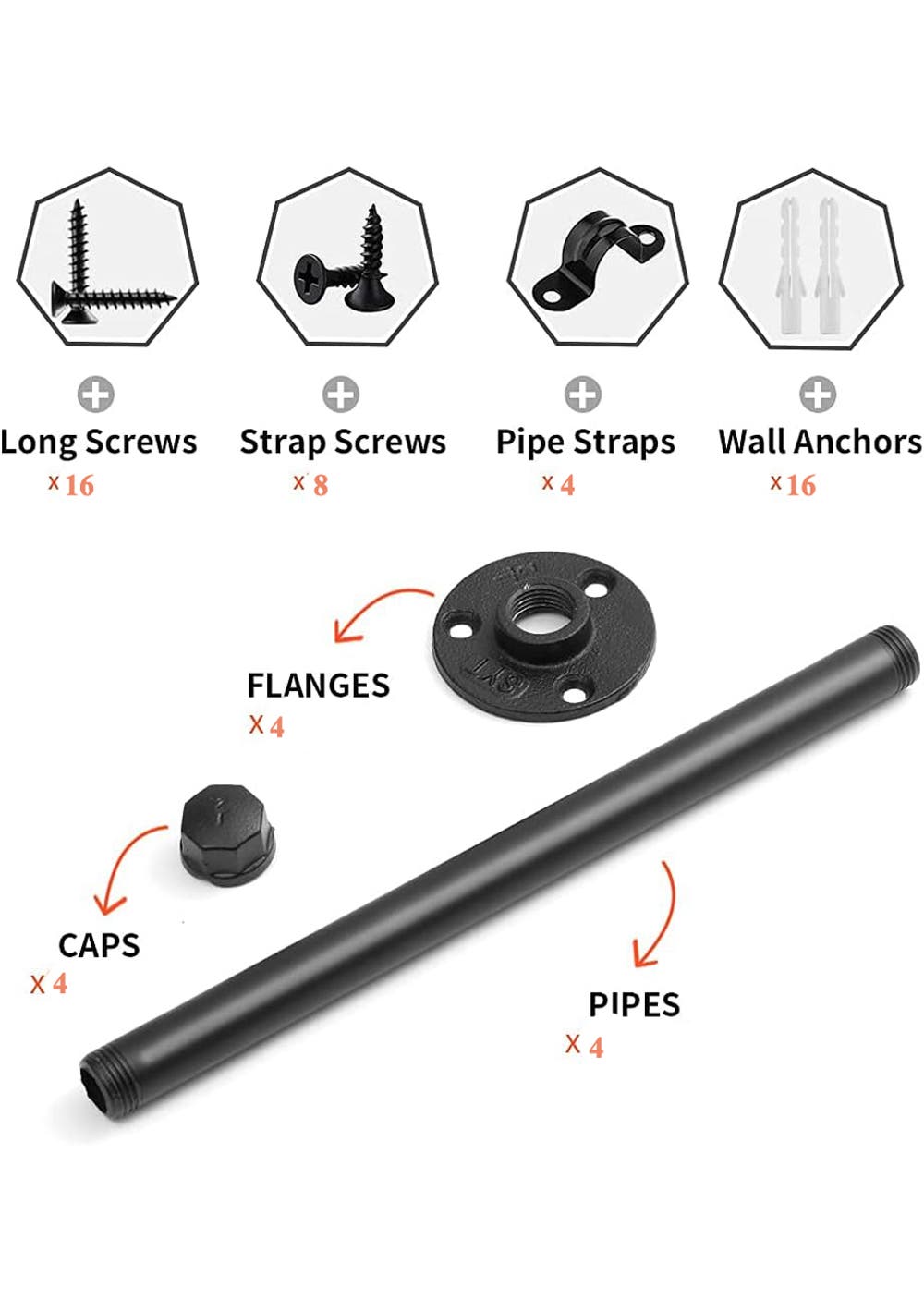 4-pack Industrial Iron Pipe DIY Floating Shelf Bracket-30CM<br><br>Material: Iron<br>Package dimensions (LWH): 33x13x5cm<br>Weight: 1.4kg<br>• Please note that the package does not include a wooden board.<br><br><br>Features:<br>• Black Matte Surface: Elevate the appearance of your shelf with the bracket's black matte surface, which complements the industrial design with a touch of sophistication.<br>• Pipe Shelf Brackets: Constructed from black iron and topped with a wear-resistant coating, these brackets are designed to stand up against daily wear and tear, scratches, corrosion, and tarnishing. Their design is reminiscent of vintage and industrial styles, making them a trendy choice for any decor.<br>• DIY Brackets: Set up is a breeze with these easy-to-install brackets. Simply secure the pipe shelving in place, and then you can place a wood board on top for an instant shelf. <br>• Maximized Convenience: These wall-mounted pipe shelves don't just serve a decorative purpose. They provide additional storage space where you need it, making organization easier and more convenient for you.<br>• Versatile Application: The shelf brackets are versatile and can be used in various settings including shops, workshops, motorhomes, backyards, rooms, kitchens, bathrooms, and more. <br><br>Package Includes:<br>• 4X [¾" Cast Iron Pipe Cap]<br>• 4X [¾" Cast Iron Floor Flange]<br>• 4X [¾" Cast Iron Industrial Pipe -30cm]<br>• 16 x Long Screws Set<br>• 8 X strap Screws set<br>• 4 X pipe Straps<br>• 16X Wall Anchors<br>Please note that the package does not include a wooden board.