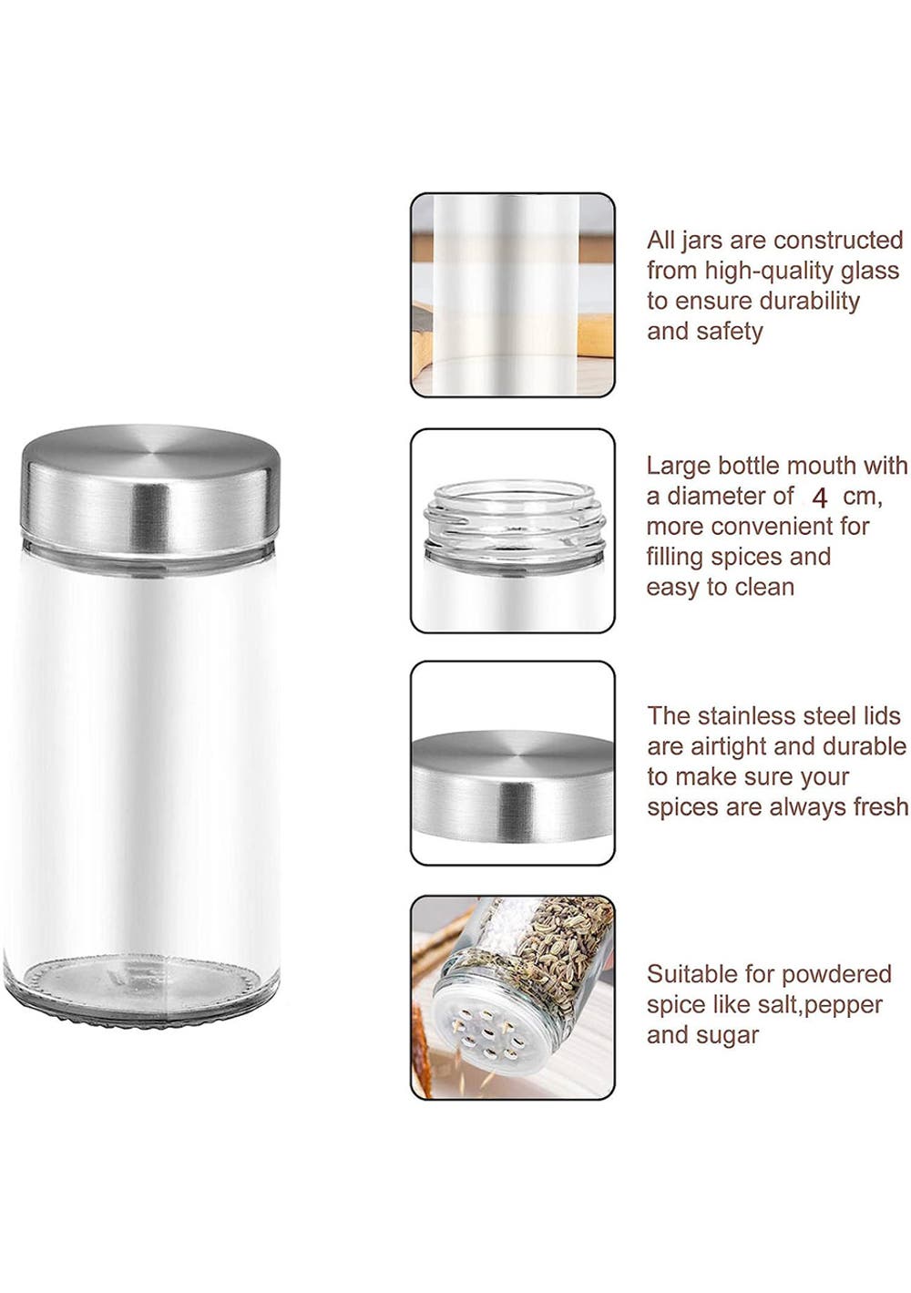 Standing 20-Jar Countertop Spice Rack with handle<br><br>Material: Stainless Steel, MDF, Glass<br>Product dimensions (LWH): overall size 29.2×12.7×33.5cm<br> Each jar size Φ4.4x9.4cm<br>Package dimensions (LWH): 35x29x13cm<br>Weight: 2.9Kg<br>Feature<br>【Exquisite Spice Rack】 Display and store up to 20 jars of spices or different bottles. The freestanding vertical layered vertical design is clear, space-saving and easy to grip.<br>【Solid Frame】 Sturdy and durable steel with powder coated surface, solid construction and exquisite smooth surface design, perfect for long term use and home decoration.<br>【Antidrop Design】When the spice jar is placed on the free standing spice rack, slightly inclined jar storage racks and a back stopper bar to help ensure they will not easily slip out or drop with moderate movement.<br><br><br>Package Include<br> 1 x Spice Rack Stainless Steel with handle<br> 20 xJars