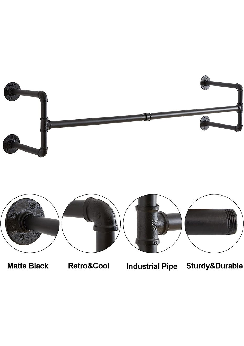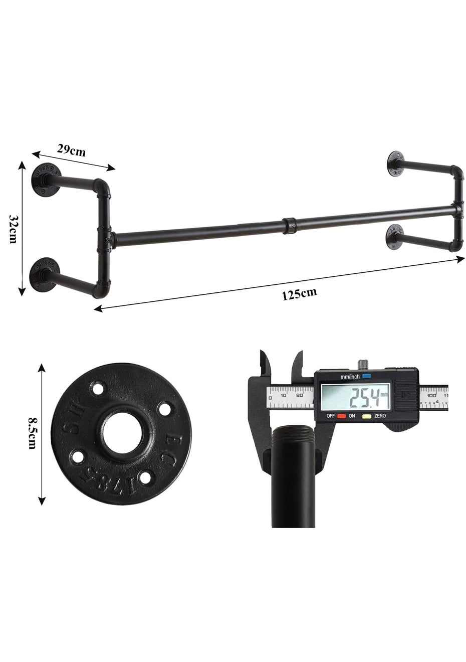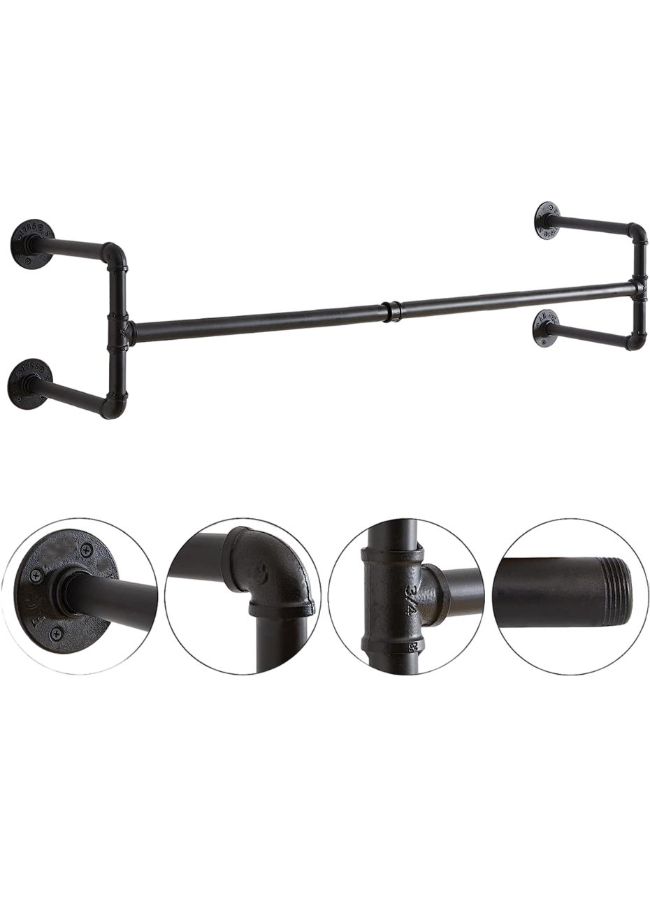 Industrial Pipe Garment Bar - 125CM<br>Material: Iron<br>Product dimensions (LWH): 125(L)cm × 29(H)cm<br>Package dimensions (LWH): 120x12x12cm<br>Weight: 2.8KG<br>Features:<br>• 【Product Size】: This Industrial Pipe Garment Bar is assembled using a 3/4" thread. The Garment Bar length is 120cm(60cmX2), with overall measurements being 125cm L x 29cm H.<br>• 【Black Matte Surface】: The product features a black matte surface finish, lending an elegant touch to its robust industrial design.<br>• 【Space-Saving & Convenient】: Tired of ironing out wrinkles from folded clothes due to lack of closet space? This wall-mounted clothing rack provides the ideal solution by giving you a space to hang your clothes, reducing wrinkles and saving you time.<br>• 【Sturdy and Durable】: Crafted from strong, malleable iron, this clothes hanging rack can support over 40KG of weight. Its industrial design is further enhanced by an electroplated protective coat for corrosion resistance and prevention of rust accumulation.<br>• 【Versatile Use】: This garment bar isn't just great for clothes, hats, and scarves in laundry rooms, closets, hallways, entryways, bedrooms, and clothing retail stores. You can also use it to hang towels or plants for added room decoration. Its stylish design integrates perfectly with your home decor.<br>• 【Easy Installation】: All parts of this rack are detachable. Make sure to screw them tightly before mounting it to a solid wall. The package includes hardware for mounting on concrete, tile walls, or other types of walls.<br>Package Includes<br>4 x [¾" Cast Iron Floor Flange]<br>1 x [¾"Cast Iron Coupling]<br>2 x [¾" Cast Iron Tee]<br>4 x [¾" 90 Degree Elbow Connector]<br>4 x [¾" Cast Iron Industrial Pipe -15cm]<br>4 x [¾" Cast Iron Industrial Pipe -25cm]<br>2 x [¾" Cast Iron Industrial Pipe -60cm]<br>4 x Screws Kit