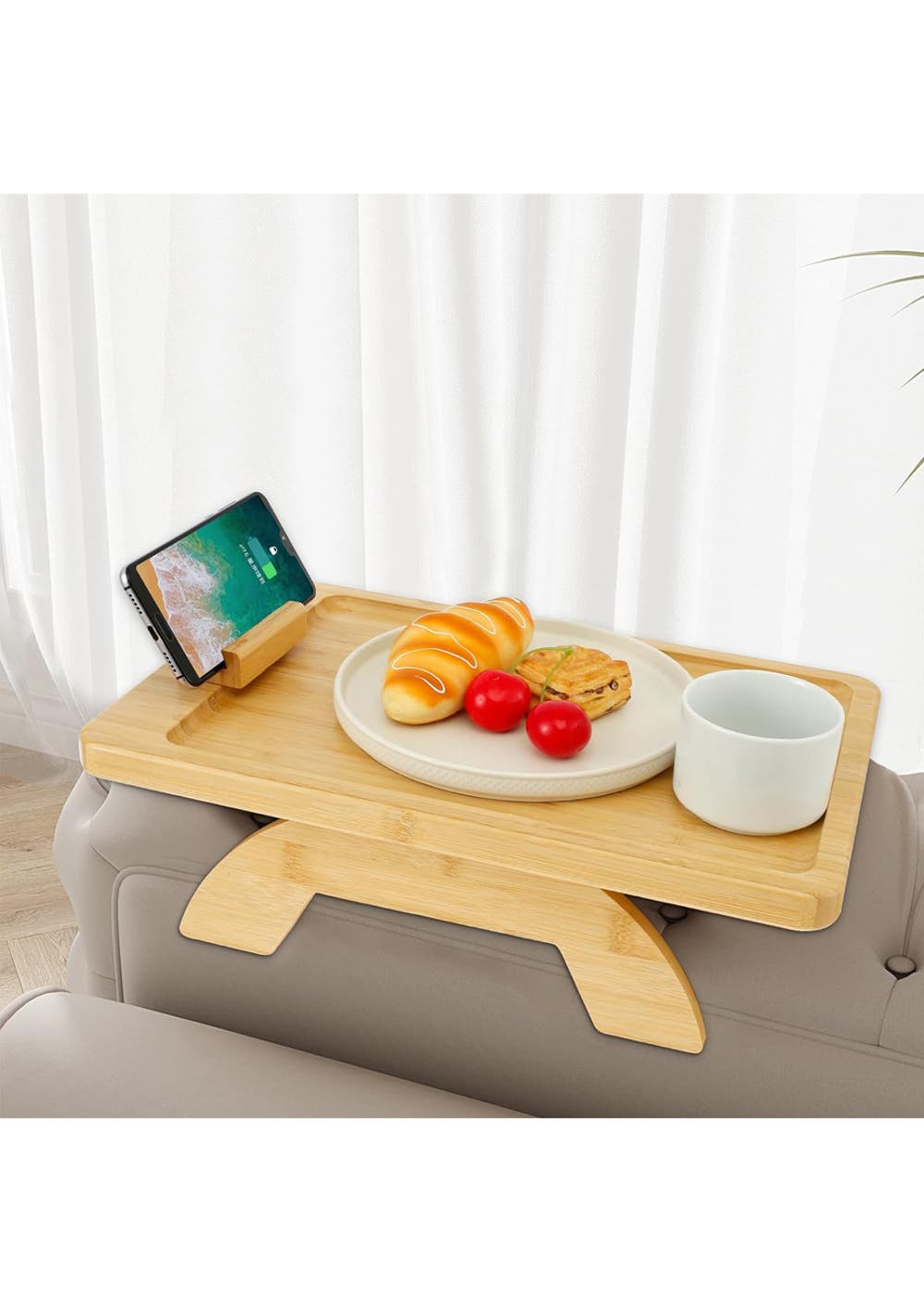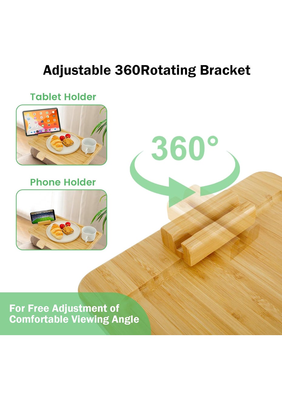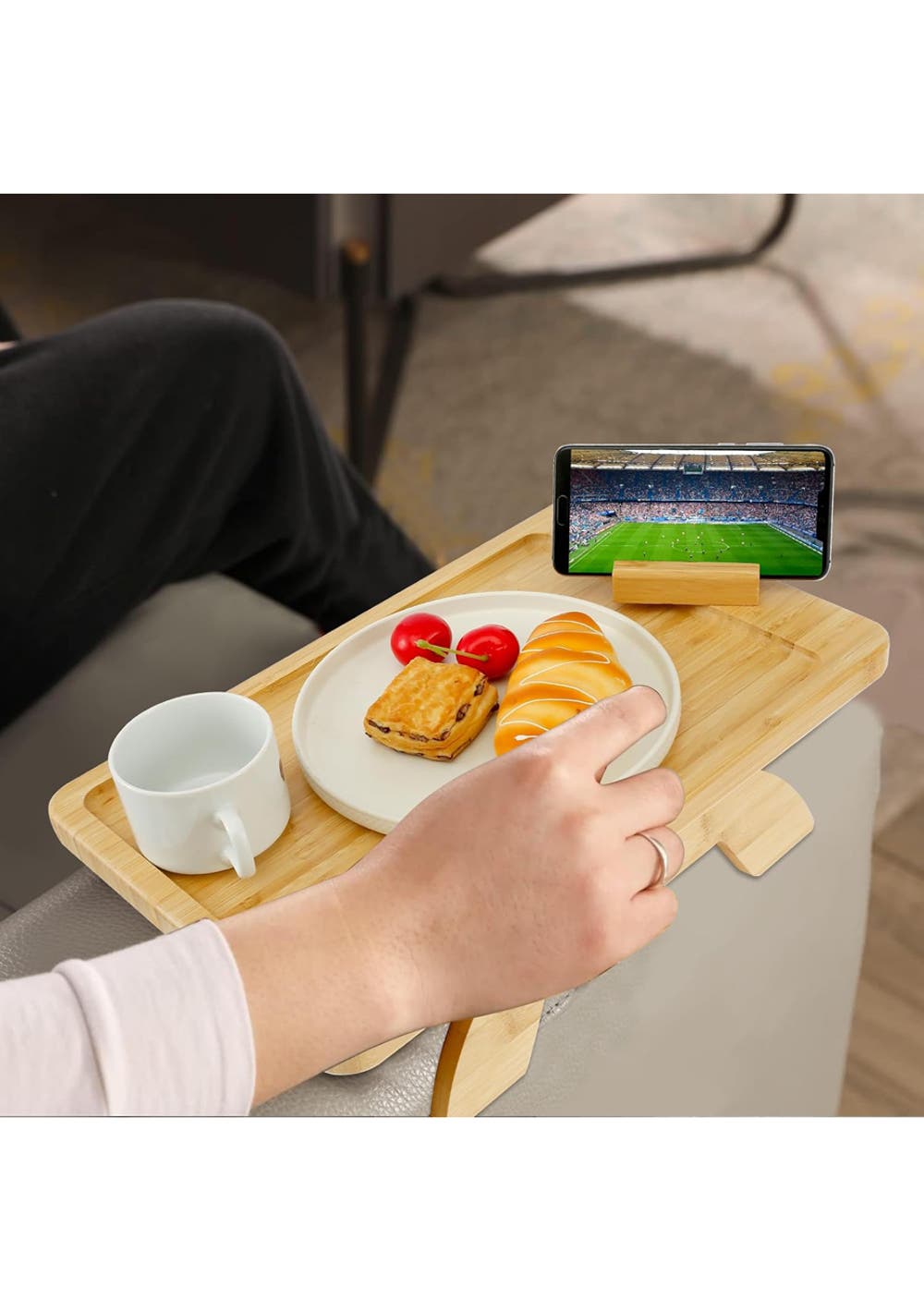 360° Rotating Phone Holder: This sofa arm tray table is equipped with a 360° rotating phone holder that offers different viewing angles, making it perfect for watching videos while eating and drinking. The quality spring-back hinge at the bottom ensures stability, preventing shaking and sliding, thus keeping your food and beverage secure.
