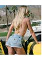 A 99 Low short is a low rise and mini inleg length Made with non-stretch rigid denim Esmeralda is a bright blue stonewash denim Finished with wheat stitching and silver trims Finished with silver trims
