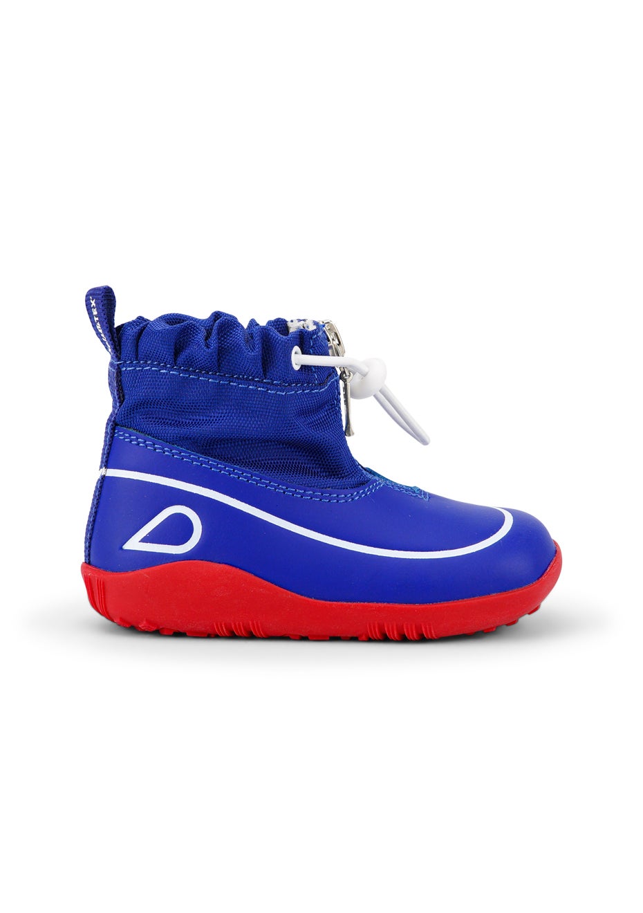 Ultra flexible and lightweight, the Splash - seen here with a bright blueberry upper and red sole is our supreme wet weather boot. The SplashTEX internal waterproof membrane and advanced construction mean little feet stay dry.The premium coated leather upper is durable and prevents water from soaking feet and toes and a front zip and bungy elastic toggle makes for easy-on and adjustability and a soft knit lining provides warmth and comfort. These boots fit true to size and are perfect for first walkers.