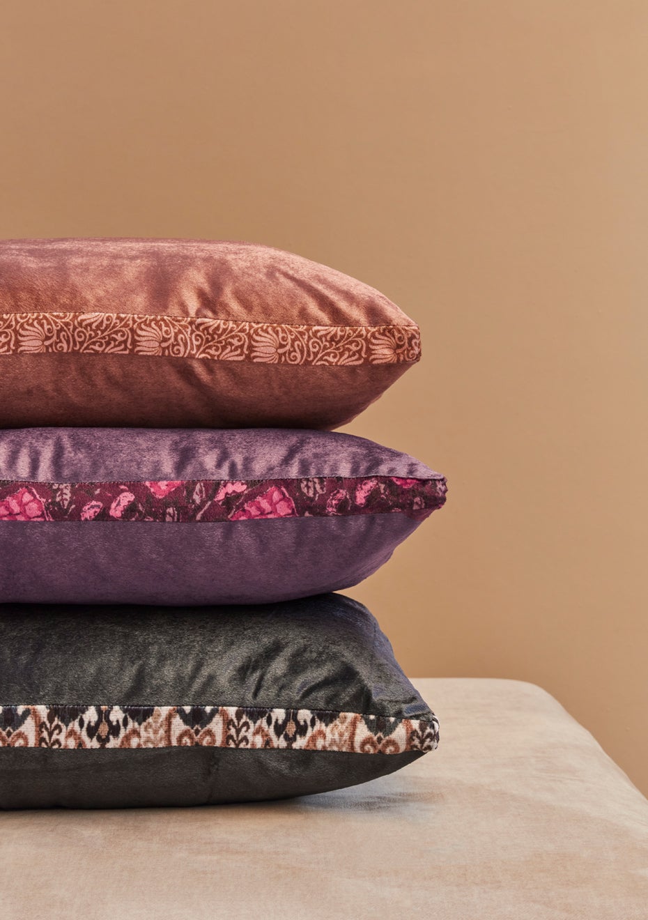 KAAT Amsterdam''s shiny, velvet Boline decorative cushion is an elegant and timeless cushion.... but there''s more! The side has a rich ornamental and abstract floral print in shades of purple and pink. Adding a funky, contemporary vibe to the cushion! A unique combination that means the Boline decorative cushion complements a range of interior styles. The decorative cushion pairs really well with the Ayda decorative cushion and Odin throw from the KAAT Amsterdam collection. The backside of the cushion is in a plain aubergine colour.Decorative cushion Boline is made of 100% polyester velvet. The size is 40 x 60 cm. The cushion has a zipper at the bottom and comes with a resilient polyester inner cushion. Nice detail: the cushion has a golden puller at the zipper in the shape of an Amsterdam canal house. The cushion is not suitable for machine washing or tumble drying. 1 x Cushion: 40cm x 60cm The zip of the small decorative cushion has a gold-coloured puller in the shape of an Amsterdam canalside house.