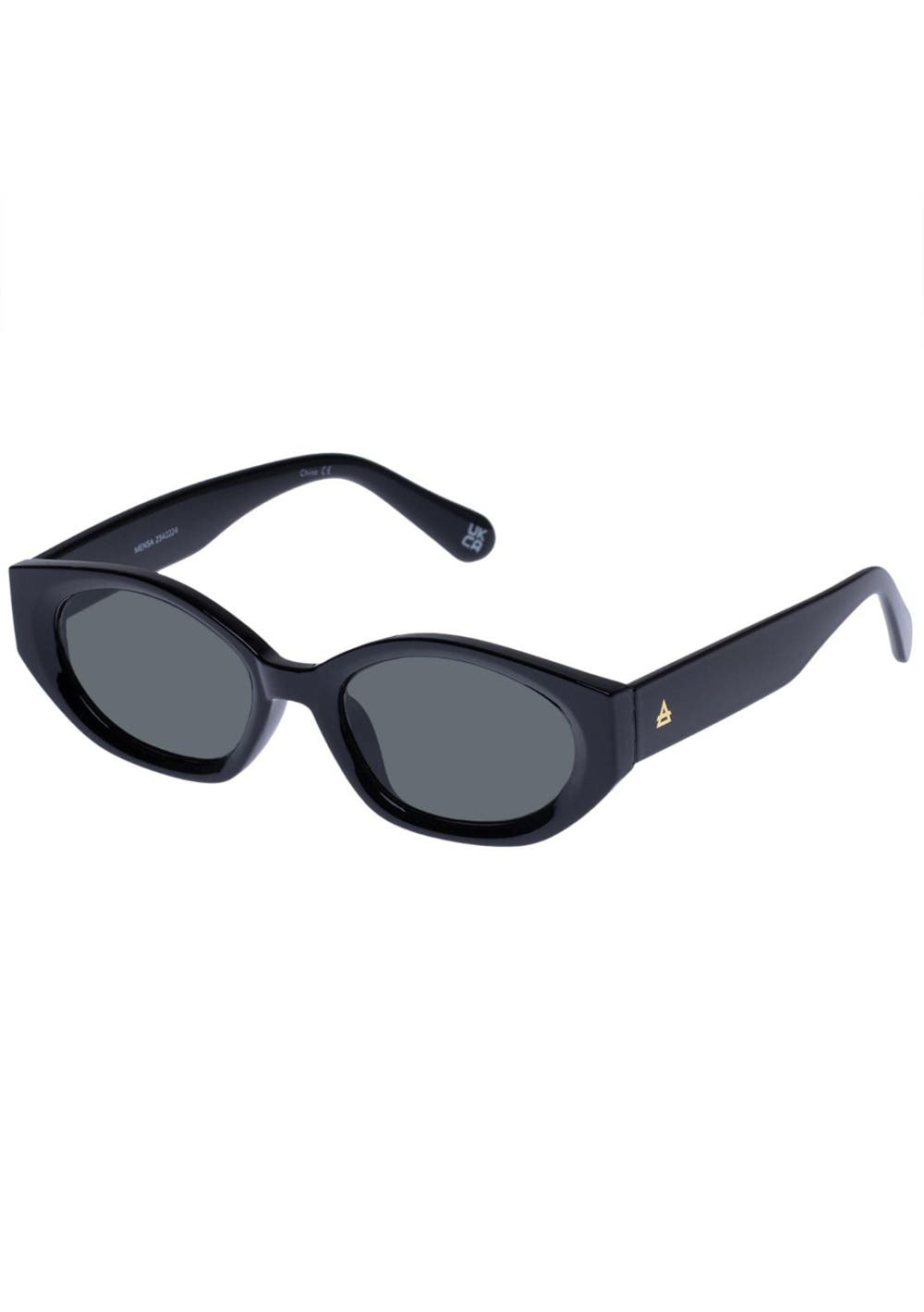 A modern take on the cat eye shape! Designed with a look that is sure to command VIP treatment. Featuring a flat top design with sharp, modern angles. Black frame featuring green mono lenses. AIRE gold foil logo detailing on both temples. Made using 100% GRS certified recycled polycarbonate frame material.