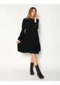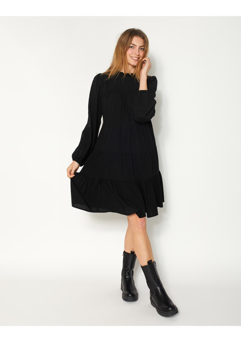 High crew neck knee length dress with frill detail and tiered body layers. 100% VISCOSE