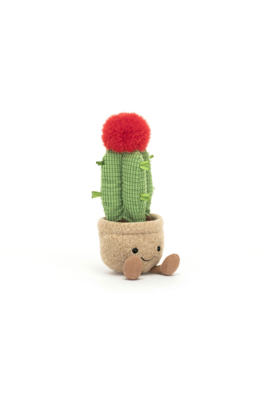Looking pretty funky with a fluffy red crown and green grid-pattern stem, it’s Amuseable Moon Cactus! This dandy plant has an oaty felt pot, chocolate cord boots and fuzzy cocoa soil. Even the spikes are really soft ribbons!