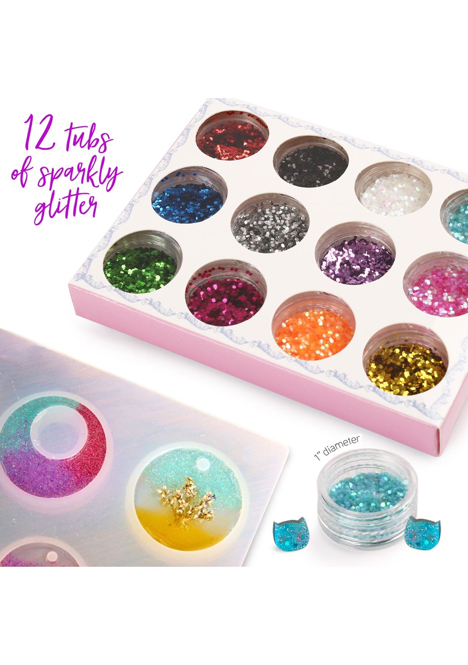 DIY JEWELRY MOLDS AND TOOLS SET: the jewelry making kit includes 65-Shapes Molds (15 Pc Silicone Gel), 12 Colors of Glitter Sequins, 25 Gold Screw Eye Pins, 25 Silver Screw Eye Pins, 5 Plastic Spoons, 5 Plastic Droppers, 5 Plastic Stirrers, 1 Hand Drill (includes 4 bit sizes)