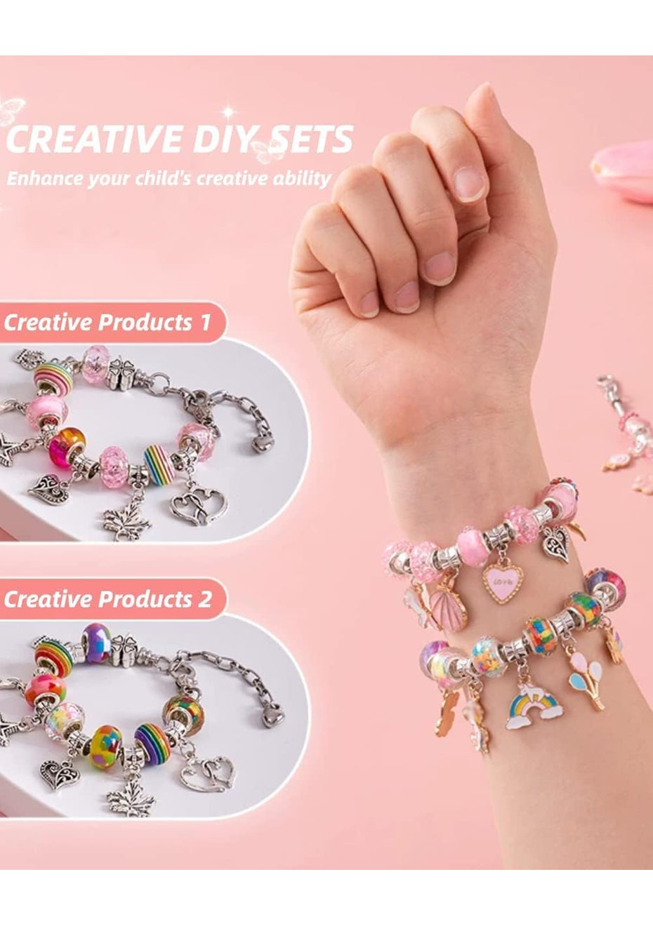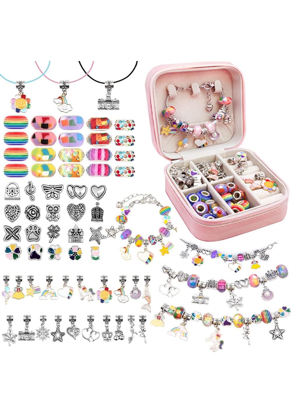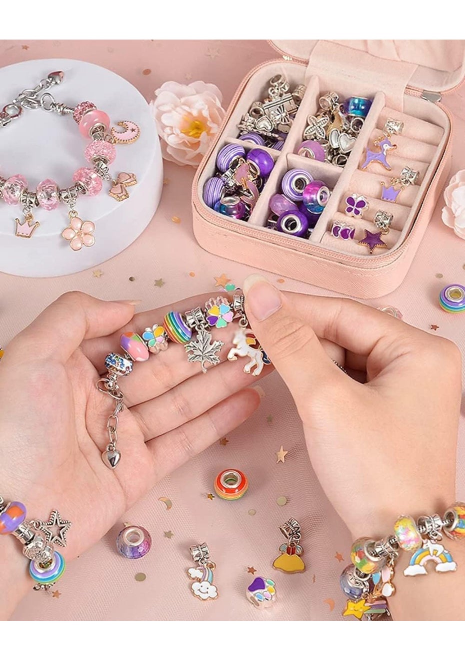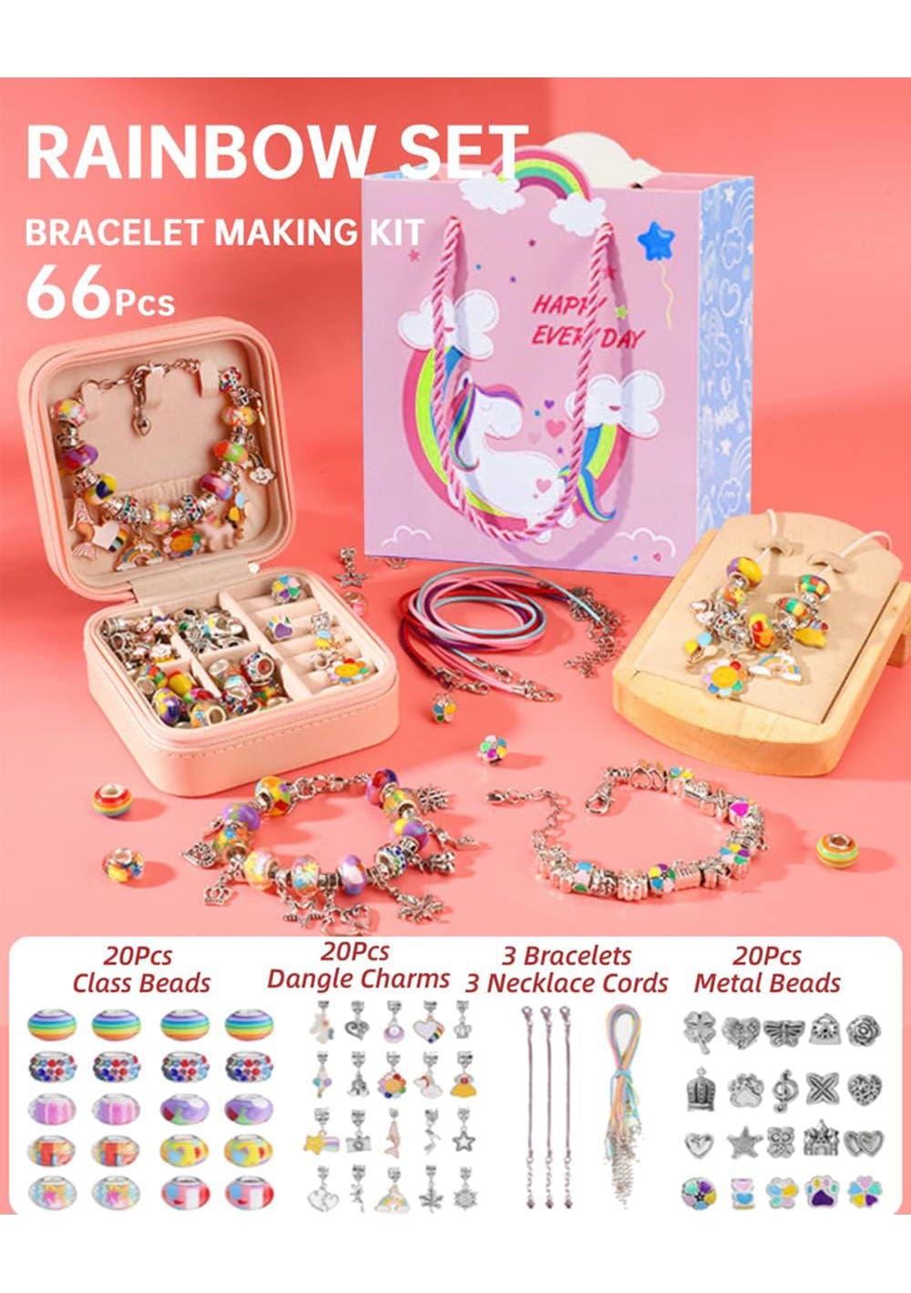 66Pcs Charm Bracelet Making Kit for Girls-Rainbow<br>Package Dimensions: 10 x 10 x 8 cm<br>weight: 200g<br>Inside this Box of Wonders:<br>Embark on an enchanting crafting journey, where every young girl's dream of becoming a princess of her own fairy-tale world becomes a reality. Perfect for children ages 5+, this kit is an inviting rainbow gateway to the joys of bracelet and necklace making.<br>Delightful Features:<br>• A Gift Beyond Imagination: Not just a craft kit, but a treasure chest that keeps little hands and hearts busy. Once they've created their masterpieces, they can spread the joy, offering a handcrafted bracelet as a token of friendship.<br>• A Canvas for Creativity: More than just an assembly of beads and strings, this kit is a playground for the imagination, fostering creativity and fine motor skills with each bead threaded and each pendant chosen.<br>• Your Personal Jewel Box: Our kit is a full package - complete with a dainty, portable jewelry box (3.93.92 inches). Neatly organize your collection of sparkling beads and gleaming pendants, all ready for their debut.<br>• The Joy of Making: Intuitive and simple, the bead bracelet making process is designed for easy learning. Unscrew, string, and screw back - voila, a custom charm bracelet blooms at your fingertips.<br>• The Ultimate Present: Ideal for girls aged 5 to 15, this kit is not only an invitation to craft but also a chance to forge bonds over shared creation, making it the quintessential gift for any occasion.<br><br>Package Include<br>• 20 vibrant big beads<br>• 20 delicate small beads<br>• 20 unique pendant accessories<br>• 3 ready-to-be-charmed bracelet <br>• 3 necklace strings <br>Plus, A Jewelry Box!<br>