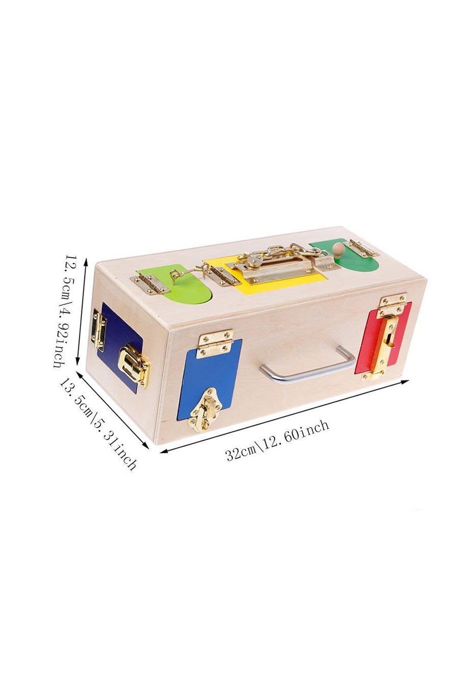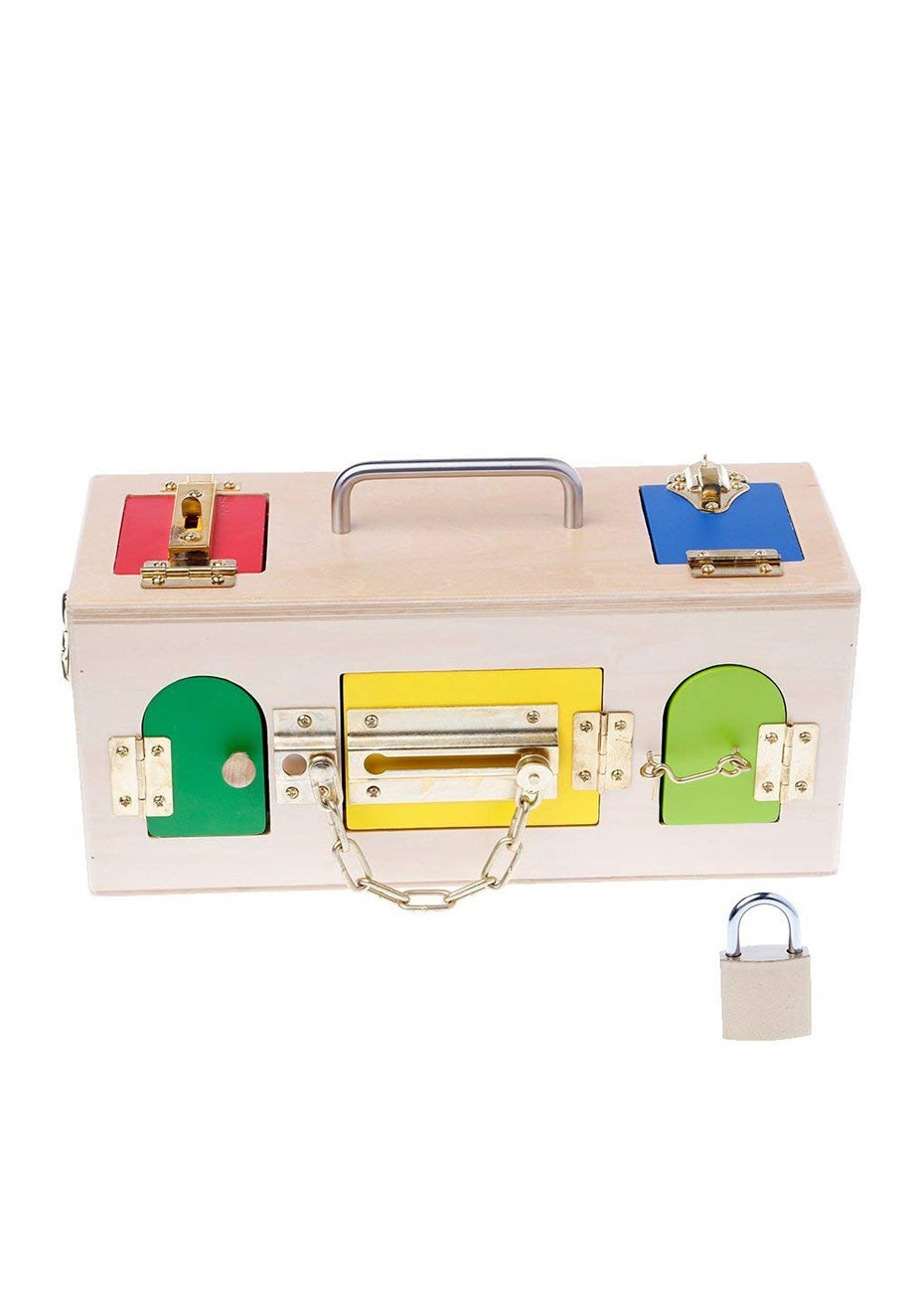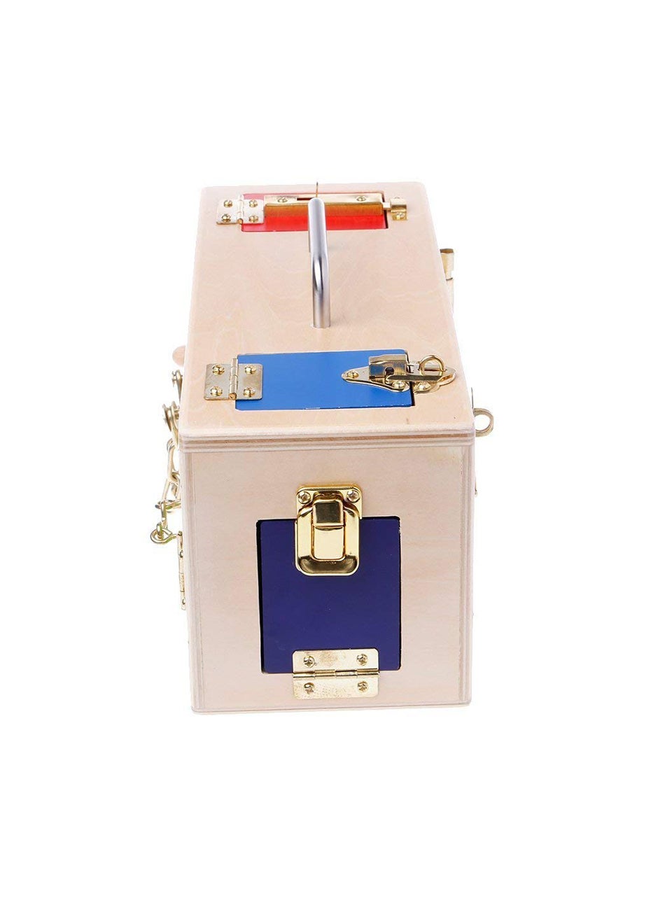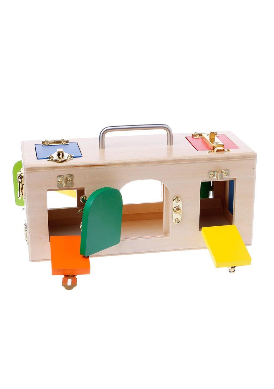 Kids Wooden puzzle box with 10 different locks, doors and latches