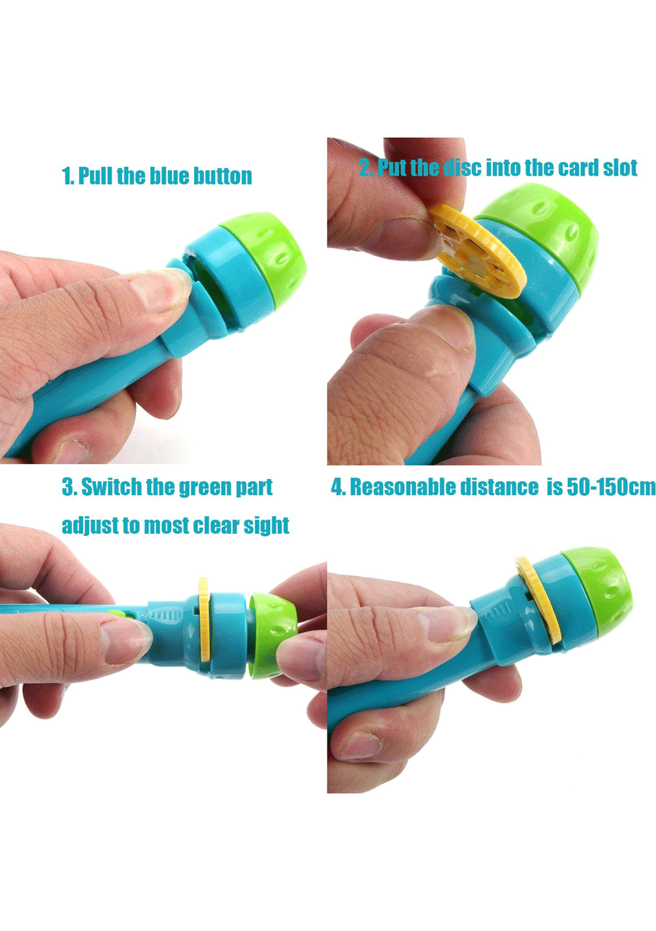 This children’s Story Projection Torch is made using high quality ABS plastic - safe and non-toxic, a pleasant design and cute image-changing picture projector allows children to continuously enjoy the play of hands and fingertips, stimulating the whole brain when viewing the images. Great Christmas gift to over 3 years old girls and boys