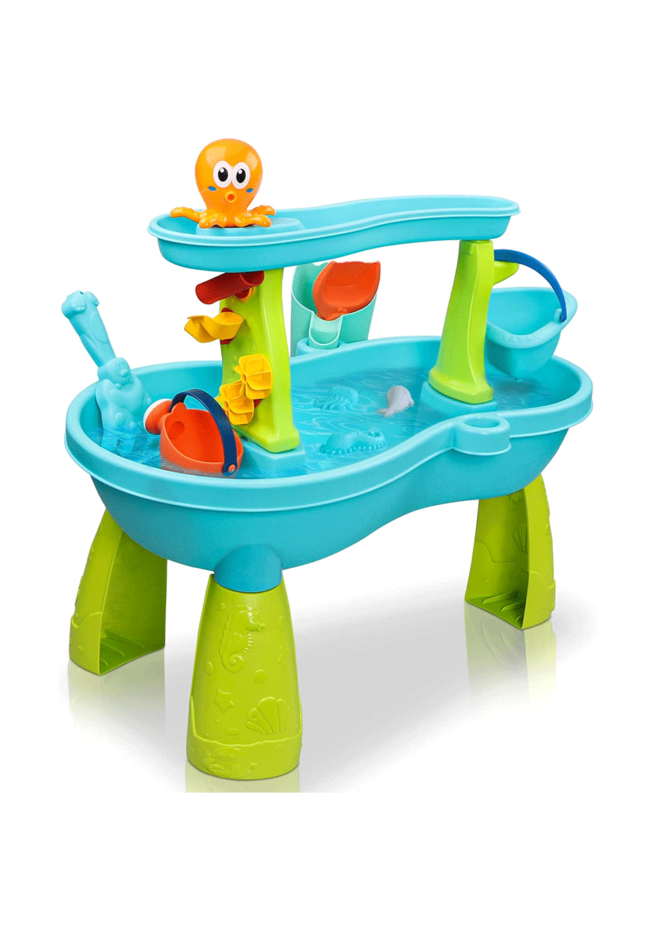 18Pcs 2 Tier Outdoor Sand and Water Table Material: PP Product dimensions (LWH): 62×37×57cm Package dimensions (LWH): 61 x35x13cm Weight: 1.93Kg KEY FEATURES:  Easy to Assemble and Clean: You can assemble this sand and water table with your kids to enhance the parent-child relationship. It’s very easy and will not cost you much time. This outdoor toy is a good choice for family entertainment activities this summer.  Suitable Age: 3+  Multiple Ways to Play: Use a double-layer structure design that can hold water, sand, soil, or anything you want to play with. Let toddlers start their wonderful journey of sensory exploration with this sand and water table.  Attractive Colorful Accessories: With the colorful and rich accessories, this water table for your kids will encourage them to do more tactile activities, create animal models, and make a splash or a mini waterfall. Enhance your child's hand-eye coordination and imagination.  Stable and Safe: Made of high-quality non-toxic material, so the water play table is very stable and durable. With a thicker inner seat and higher bearing capacity, you can let your kids enjoy themselves this summer without worrying about the safety problems.  Package Include  1 X 18Pcs 2 Tier Outdoor Sand and Water Table