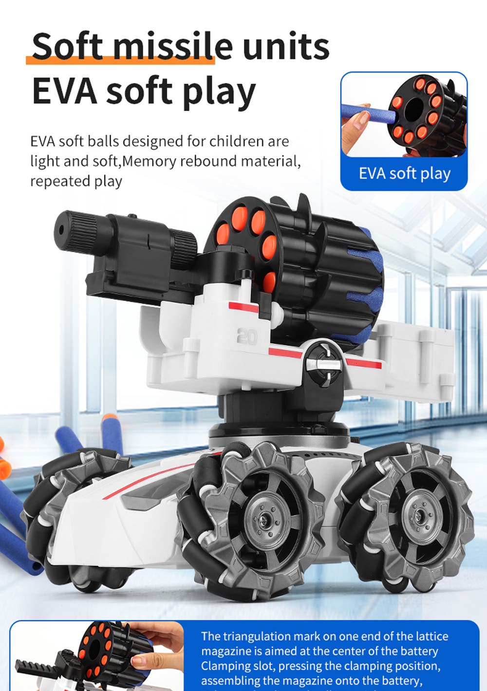 Soft Bullet 4WD Remote Control Shooting Toy Tank Material: ABS Product dimensions (LWH): 16×19×16cm Package dimensions (LWH): 17 x18 x 27cm Weight: 1150g KEY FEATURES:  Upgrade remote control technology, watch remote control + remote control, dual-mode experience of science fiction brought by technology.  Abundant functions, novel and interesting, mobile shooting, better driving experience and competitive spirit against the game. Cool sound and light effects. The front of the car is equipped with LED lights, which can turn on the sound effects for better driving.  The clever design of anti-skid tires and strong grip make off-road climbing easy.  This is a cool and exciting gift, multiplayer sports entertainment, you can play with your children, simulate army exercises and war adventures, and accompany your children every moment of their growth.  Package Include  1 x Soft Bullet 4WD Remote Control Shooting Toy Tank  1 x Remote Control  1 x Battery  1 x USB Cable  20 x Soft bullet  1 x Infrared  1 x Manual