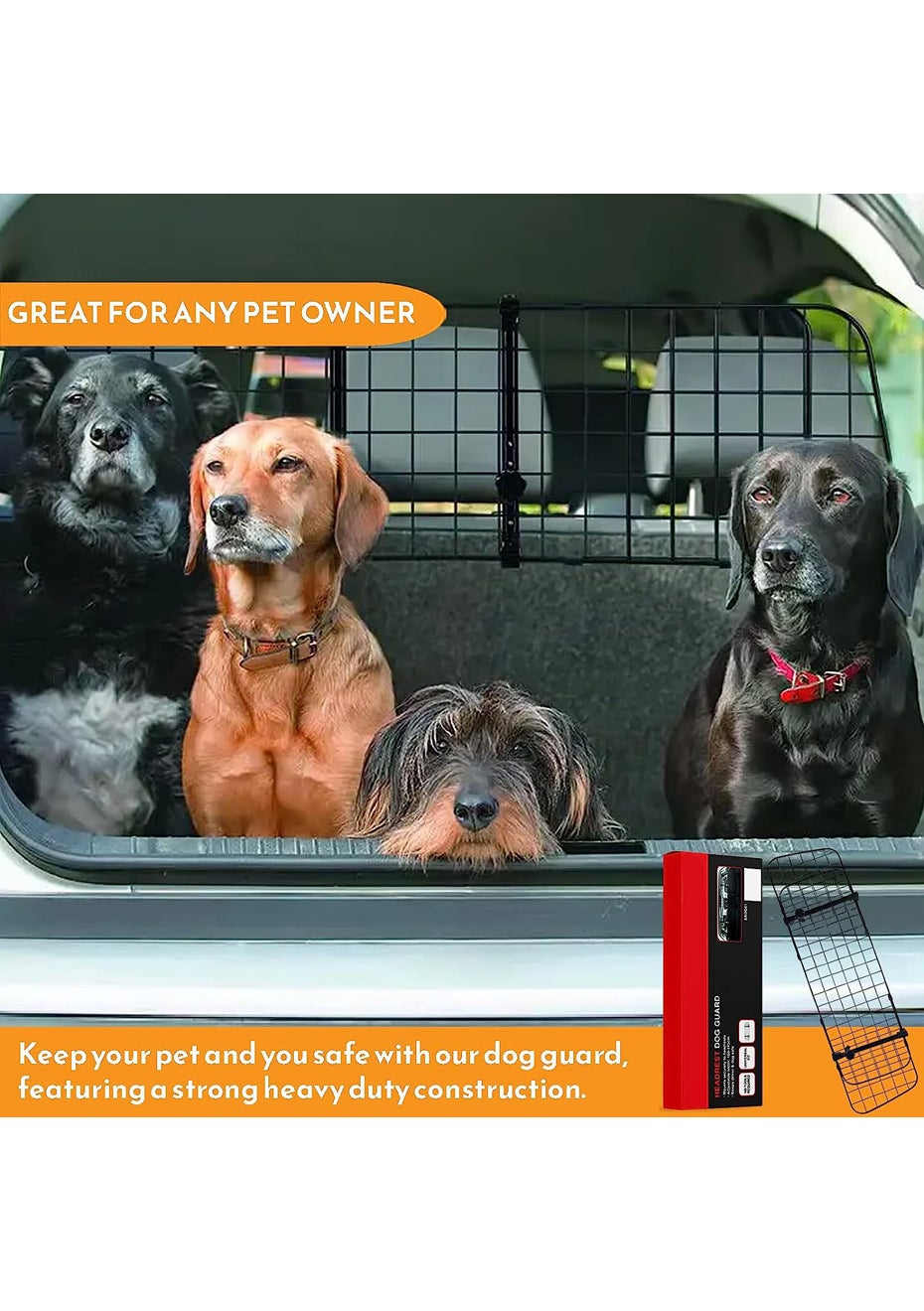 Headrest Adjustable Mesh Dog Barrier<br>Material: Steel<br>Product dimensions (LWH): Height 30.5cm x Width 91-145cm<br>Package dimensions (LWH): 93x32x5cm<br>Weight: 2.5Kg<br>Features:<br>• HEAVY DUTY PROTECTION: This dog barrier is designed to offer heavy-duty protection for your dog and your car. It keeps your furry friend safely contained in the back of the car while you drive, preventing accidents or injuries.<br>• UNIVERSAL FIT: With its adjustable size and versatile design, this dog barrier is a perfect fit for any car boot. Whether you have a Ford Kuga, Kia Sportage, or any other car, it will fit perfectly.<br>• EASY TO INSTALL: The dog barrier comes with detailed instructions and can be easily installed in minutes without any special tools or equipment. It securely fixes in place using the car's existing anchor points, ensuring a snug and secure fit.<br>• DURABLE CONSTRUCTION: Made from high-quality steel, this dog barrier is built to last. It is resistant to rust, corrosion, and general wear and tear, providing years of reliable use.<br><br><br>Package Includes:<br><br>1 x Adjustable Vehicle Mesh Pet Dog Barrier<br>