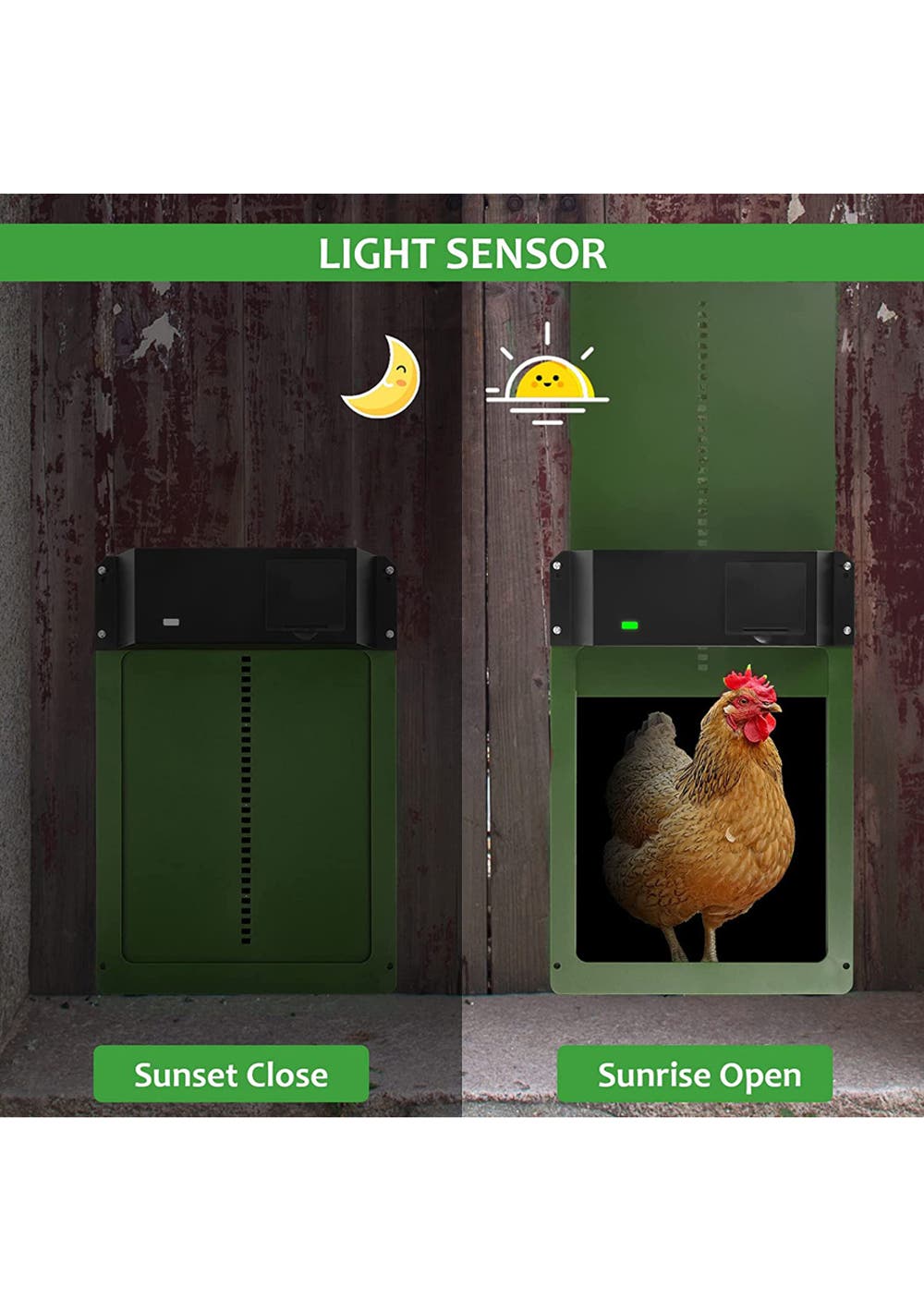 Automatic Chicken Coop Door Chicken Door Opener<br><br>Material: ABS<br>Product dimensions (LWH) : 35×24×3.7cm<br>Package dimensions (LWH): 36x25.5x5cm<br>Weight: 485g<br>Feature<br>Automatic chicken house door. Built-in motor system to make the performance more stable and reliable; the improved optical sensor has a higher sensitivity; with more advanced PC materials, it is more durable. At the same time, it can work normally in rain and high temperatures.<br>The latest optical sensor technology: the latest optical sensor technology is adopted. The chicken house door opens automatically at sunrise and closes when it gets dark. The performance is very reliable. The whole process is automatically opened and closed without manual intervention.<br>Waterproof and durable: the automatic chicken house door is made of ABS material, safe and reliable, waterproof IPX4, heat resistant and cold resistant. As the battery is sealed, it is very suitable for indoor and outdoor use.<br>Easy to use and energy saving: only 3 1.5 V ordinary batteries (excluded) be used, and save energy; there is no need for complex wiring and it is easy to use. <br>Wide range of applications: the size of the chicken door is 35 × 24 cm, which can adapt to almost any chicken size, and ducks can easily pass through. <br><br>Package Include<br> 1 x Chicken Coop Automatic Door with Light Sensor<br> 4 x screws