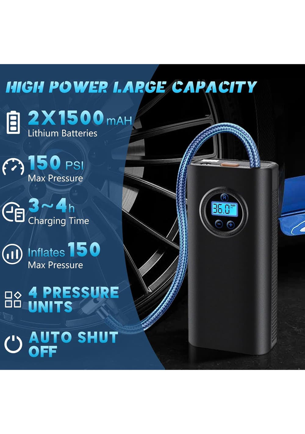 Versatile Inflation Modes: With support for multiple inflation modes—including car, bike, motorcycle, and sports ball modes—this pump allows you to set and lock a desired pressure value. The device automatically stops when the preset pressure is reached, preventing overinflation and ensuring safe operation. It inflates up to 150 PSI, making it suitable for a wide range of needs.