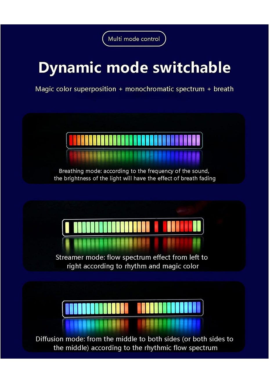 Built-in highly sensitive microphone (voice control), 8 display modes. 4 levels of brightness, 5 levels of speed and 18 color modes can be adjusted at will,